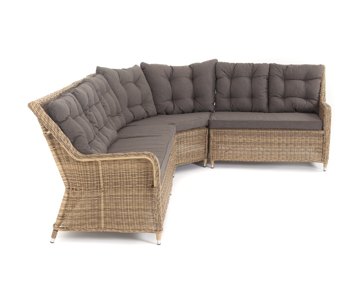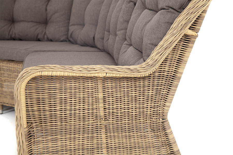 Модульный диван из искусственного ротанга «Бергамо» имеет угловую форму. Модель произведена из круглого искусственного ротанга соломенного цвета и укомплектована мягкими подушками из полиэстера с влагоотталкивающей тканью. В основе дивана - прочный алюминиевый каркас.