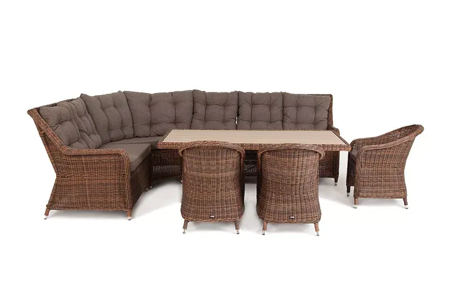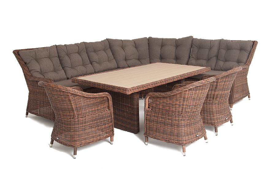 Модульный диван и кресла изготовлены посредством ручного плетения из искусственного ротанга коричневого цвета. Для укрепления конструкции использован алюминиевый каркас.