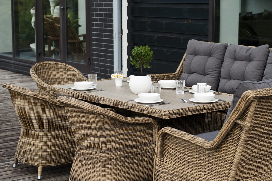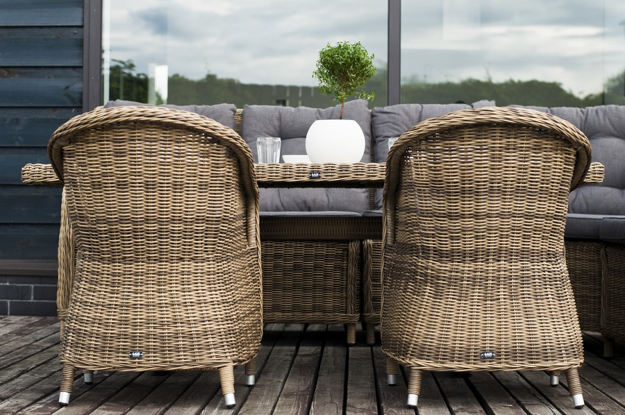 Столешница выполнена из современного полимерного материала ДПК в тон ротанга. Каркас изготовлен из прочного и легкого металла – алюминия, вручную оплетенного искусственной ротанговой лозой натурального соломенного оттенка.