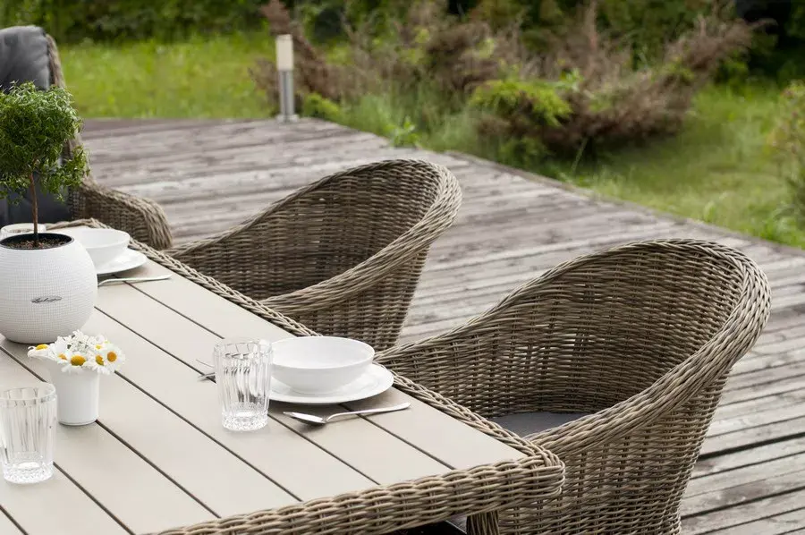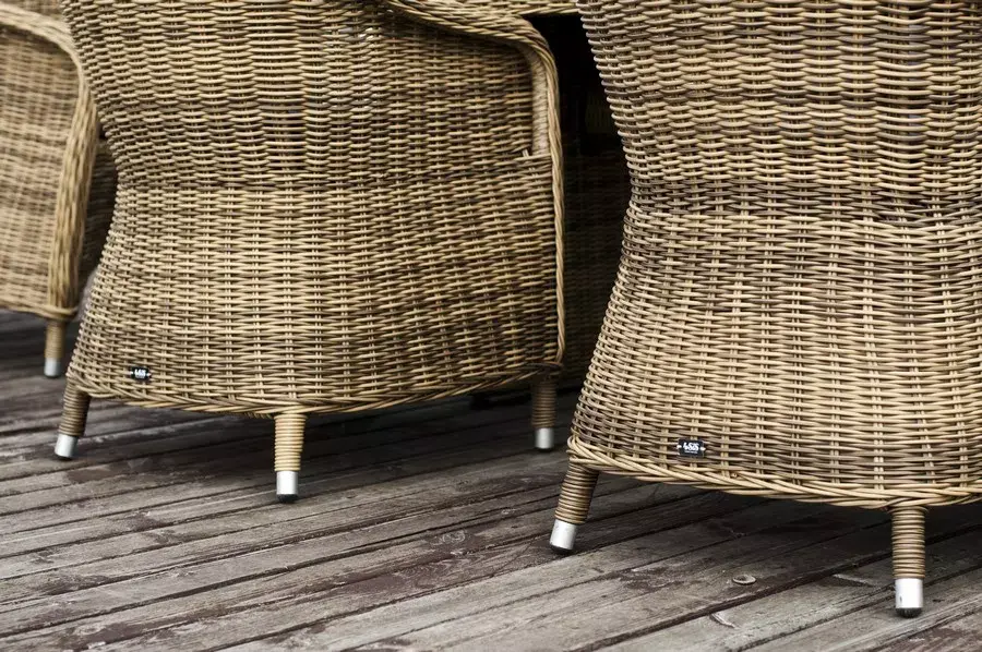 Столешница выполнена из современного полимерного материала ДПК в тон ротанга. Каркас изготовлен из прочного и легкого металла – алюминия, вручную оплетенного искусственной ротанговой лозой натурального соломенного оттенка.