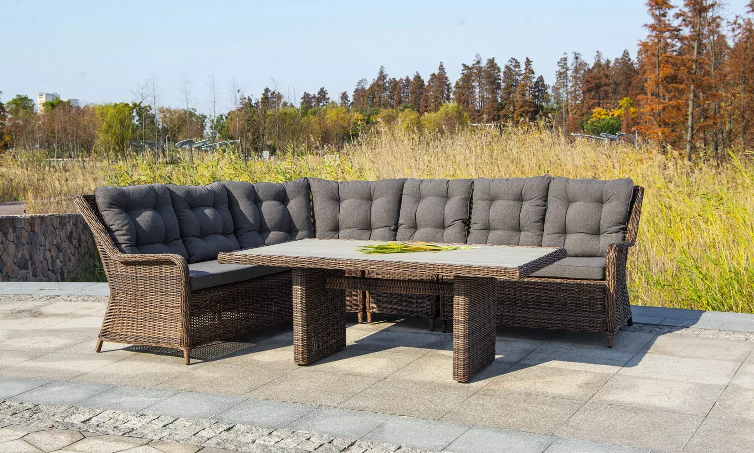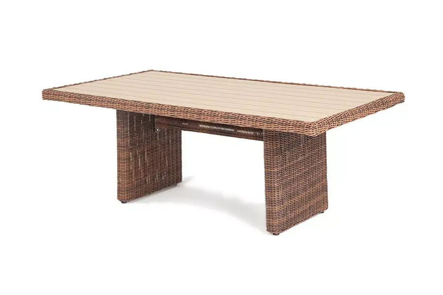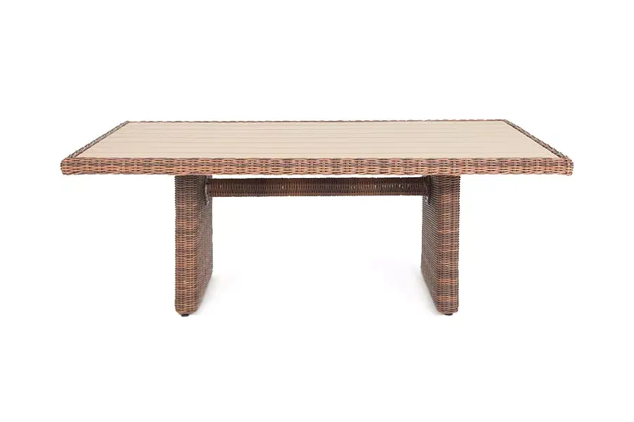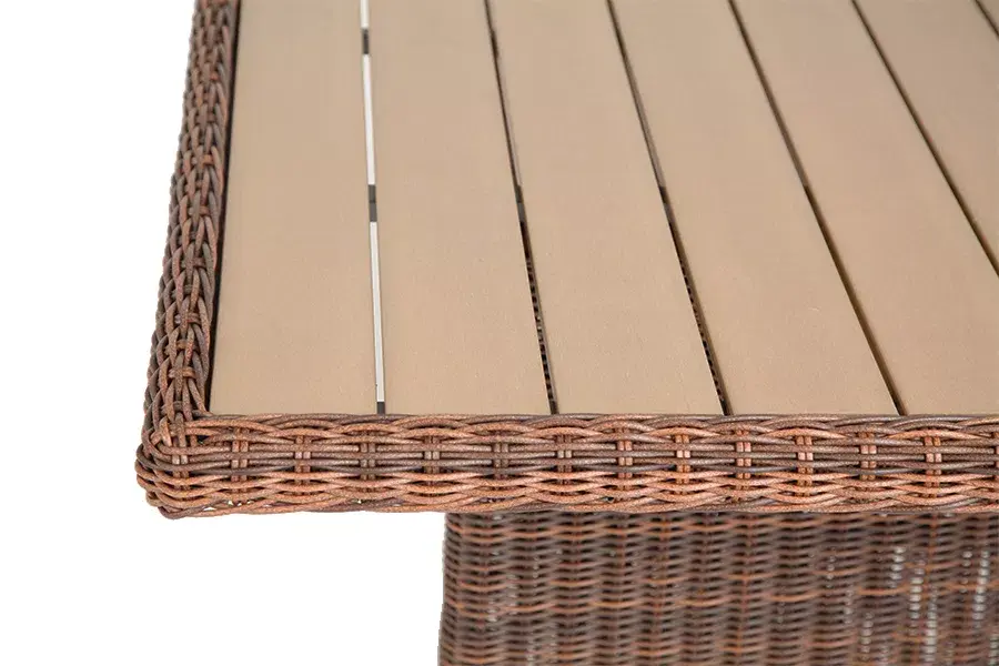 Каркас изготовлен из прочного и легкого металла – алюминия, вручную оплетенного искусственной ротанговой лозой насыщенного шоколадного оттенка. Материал прекрасно подходит для использования на открытом воздухе благодаря устойчивости к прямым солнечным лучам и атмосферным осадкам.