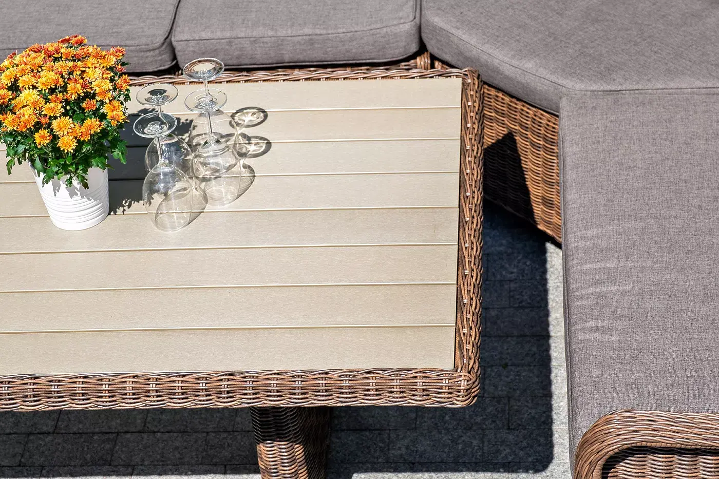 Столешница выполнена из современного полимерного материала ДПК бежевого оттенка.