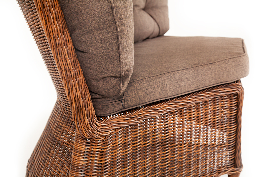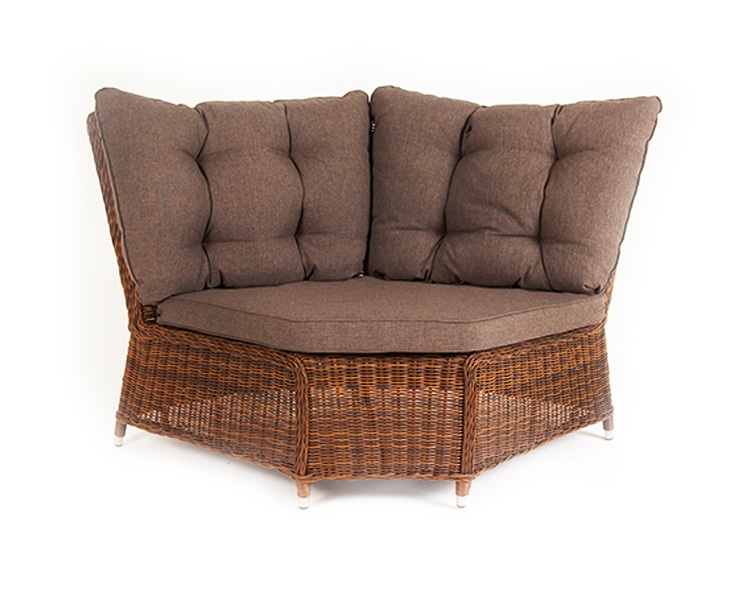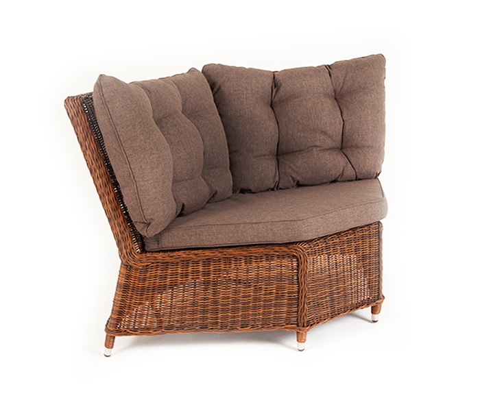 Плетеный угловой диванный модуль «Бергамо» изготовлен из алюминиевого каркаса, вручную оплетенного круглым искусственным ротангом коричневого цвета.