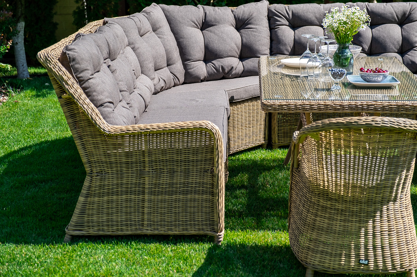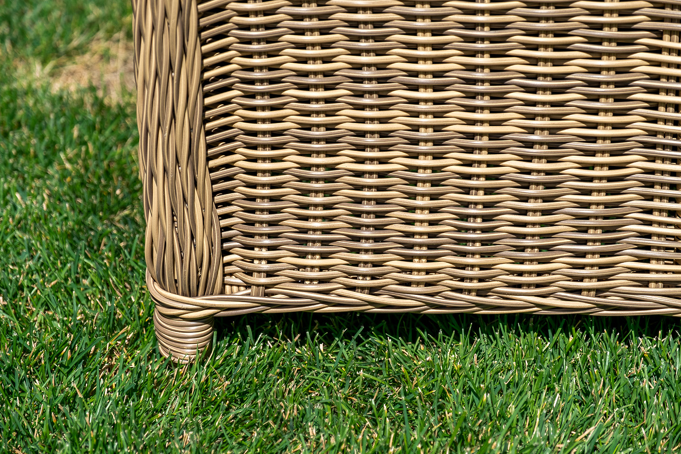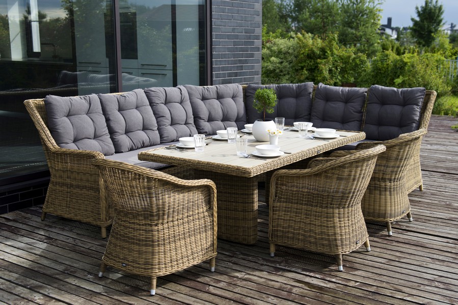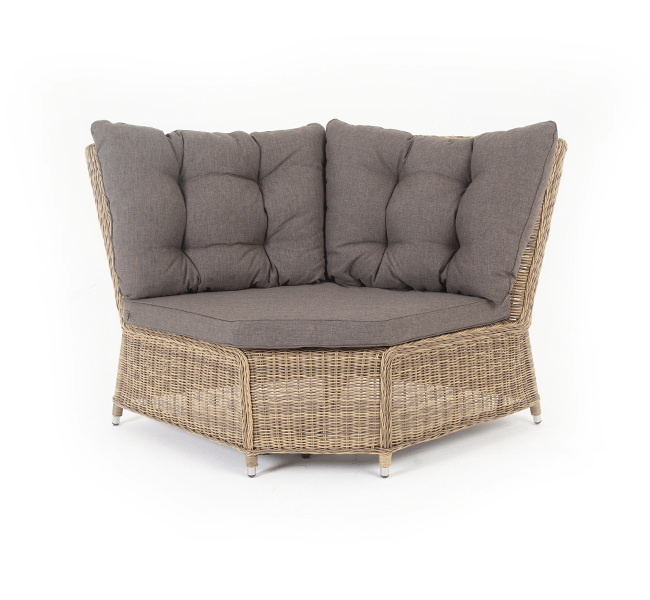 Плетеный угловой диванный модуль «Бергамо» изготовлен из алюминиевого каркаса, вручную оплетенного круглым искусственным ротангом соломенного цвета.