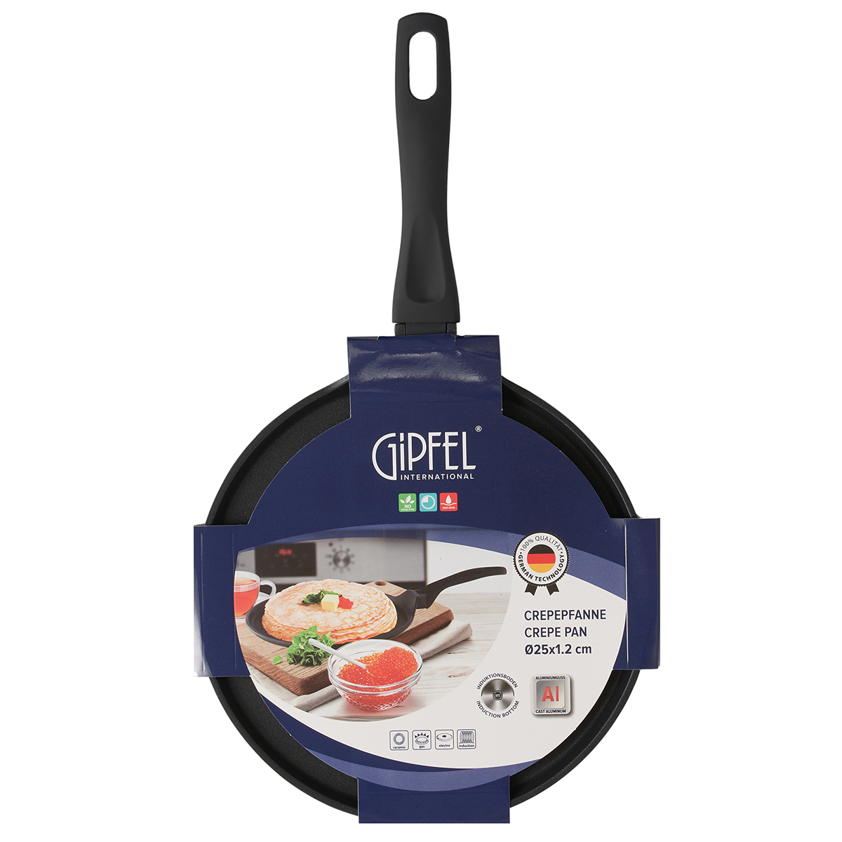 1333 Gipfel Сковорода блинная 25 см из литого алюминия с трехслойным антипригарным покрытием и индукционным дном. Толщина:1,8/3,5мм. Материал ручки: soft touch. Цвет: черный