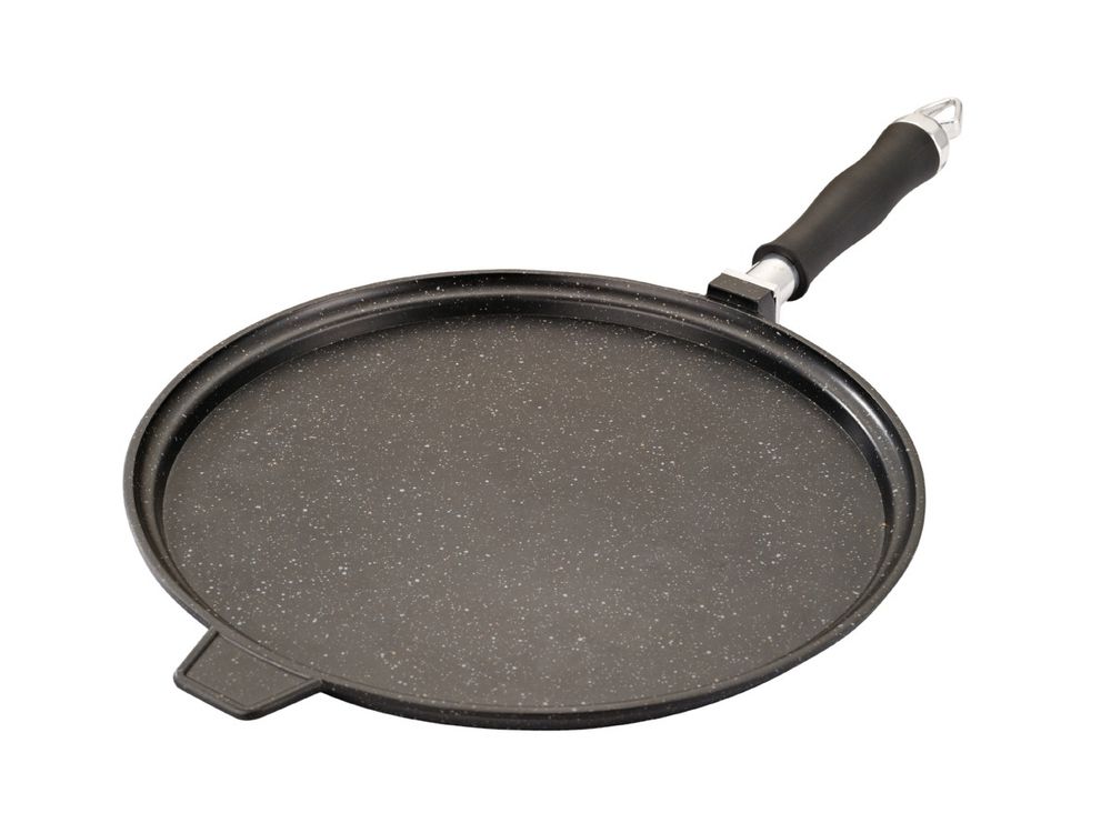 Блинная сковорода из литого алюминия. Диаметр дна составляет 32 см, а высота бортов – 2,1 см. Такие габариты идеально подходят для готовки пиццы как на плите, так и в духовке. Ручку из бакелита можно снять при необходимости, а на дно сковороды нанесено мраморное антипригарное покрытие. Модель оснащена индукционным дном.