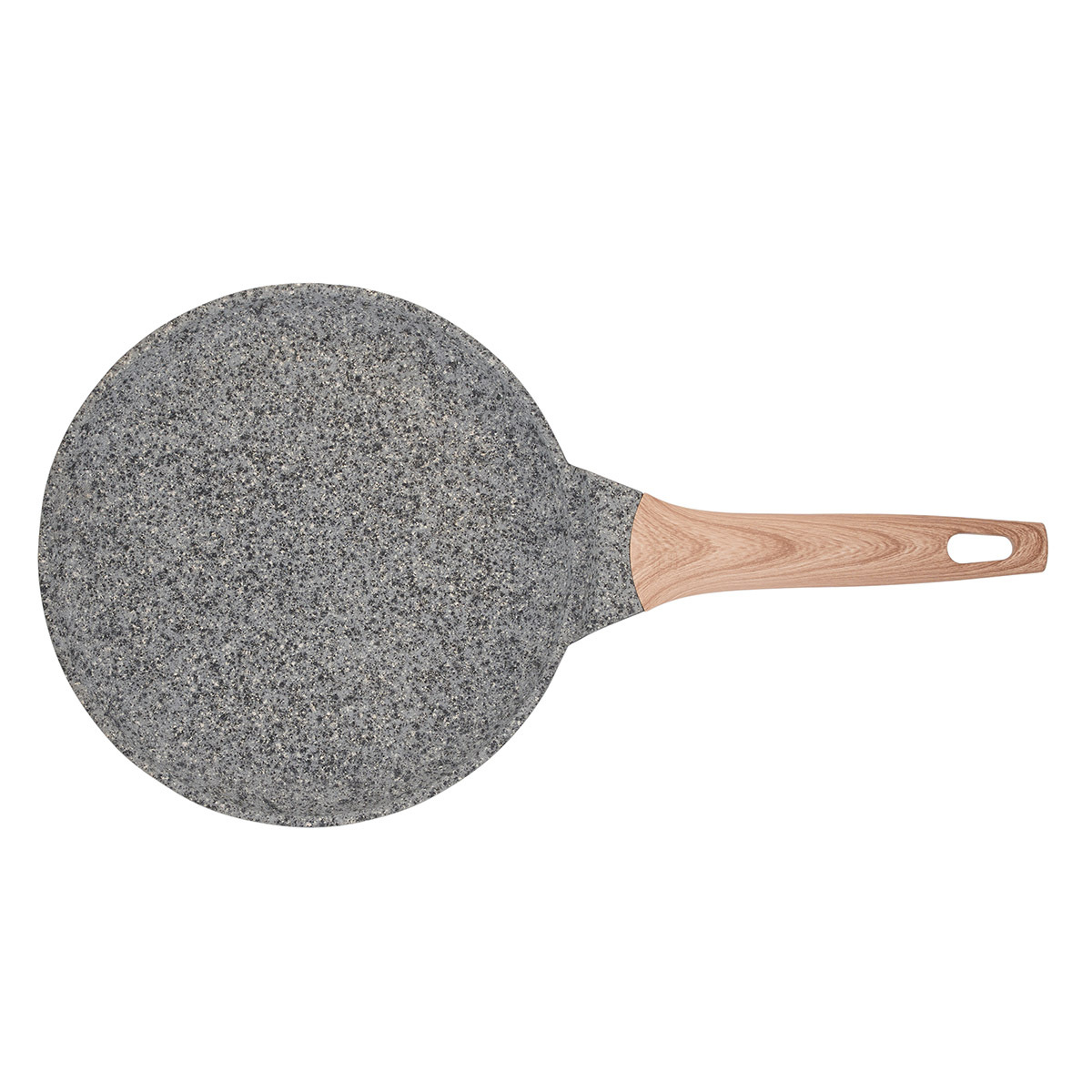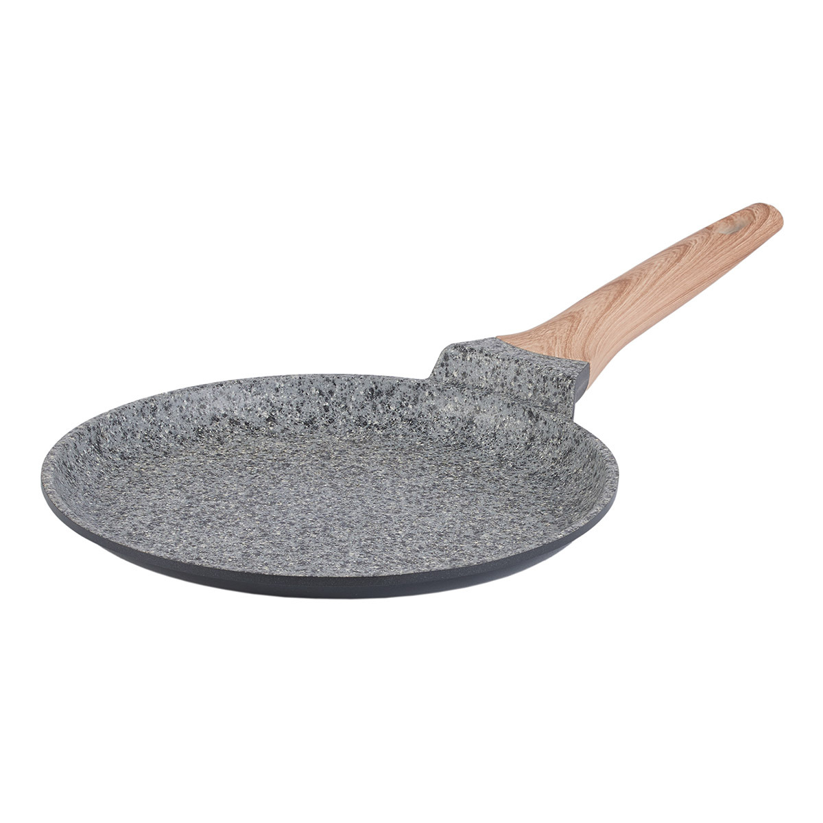 Блинная сковорода Gipfel Oliver 51169. Диаметр сковороды 24 см, высота - 2,5 см. Изготовлена из литого алюминия, с индукционным дном, трехслойным антипригарным покрытием Pfluon Granite. Толщина стенок составляет 2 мм, а дна – 4,5 мм. Бакелитовая ручка, с декором под дерево, не нагревается.