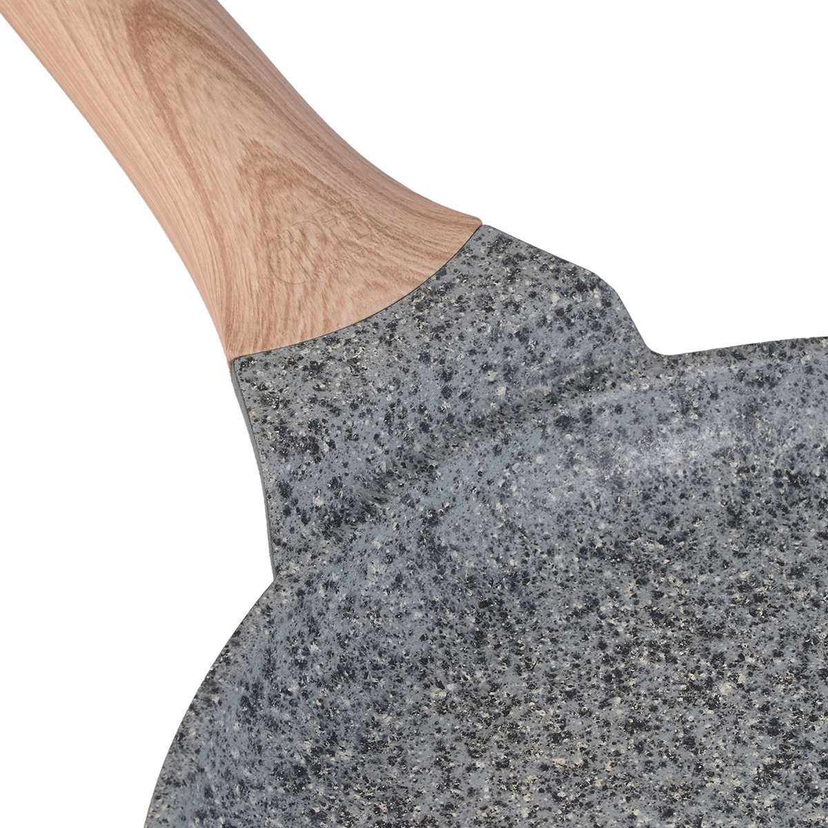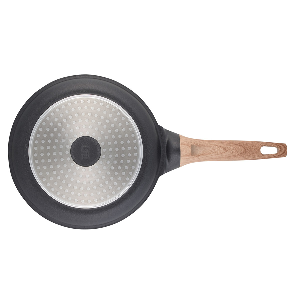 Сковорода выполнена в оригинальном дизайне: основание снаружи черного цвета, внутри - серого с вкраплениями, напоминающим фактуру гранита. Бакелитовая ручка в светло-коричневом цвете с отделкой под дерево и покрытием Soft Touch (удобно держать и не скользит в руке).
