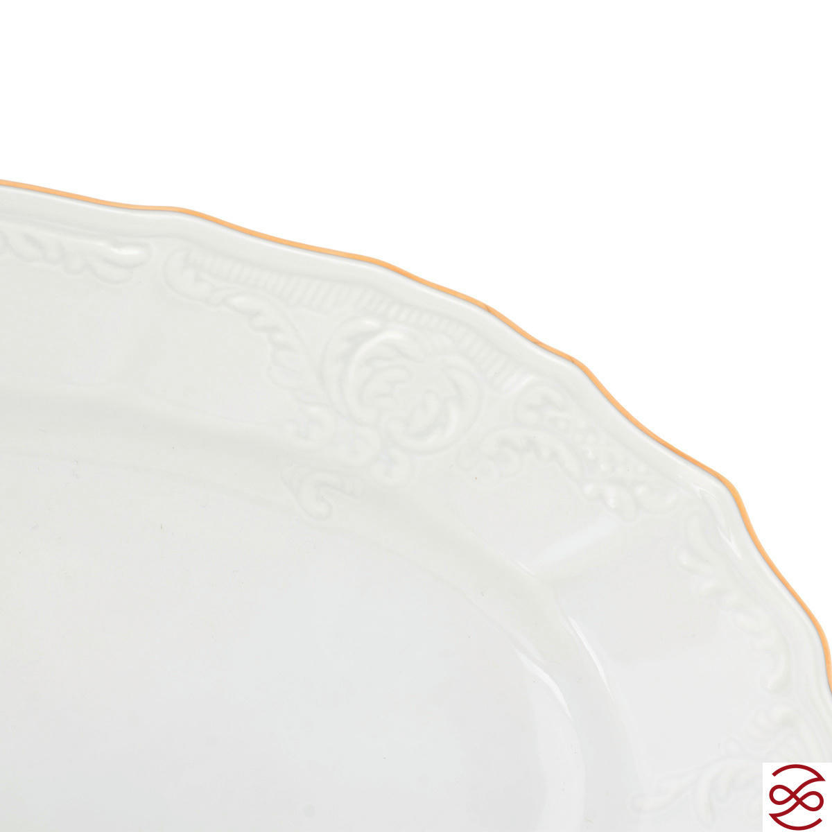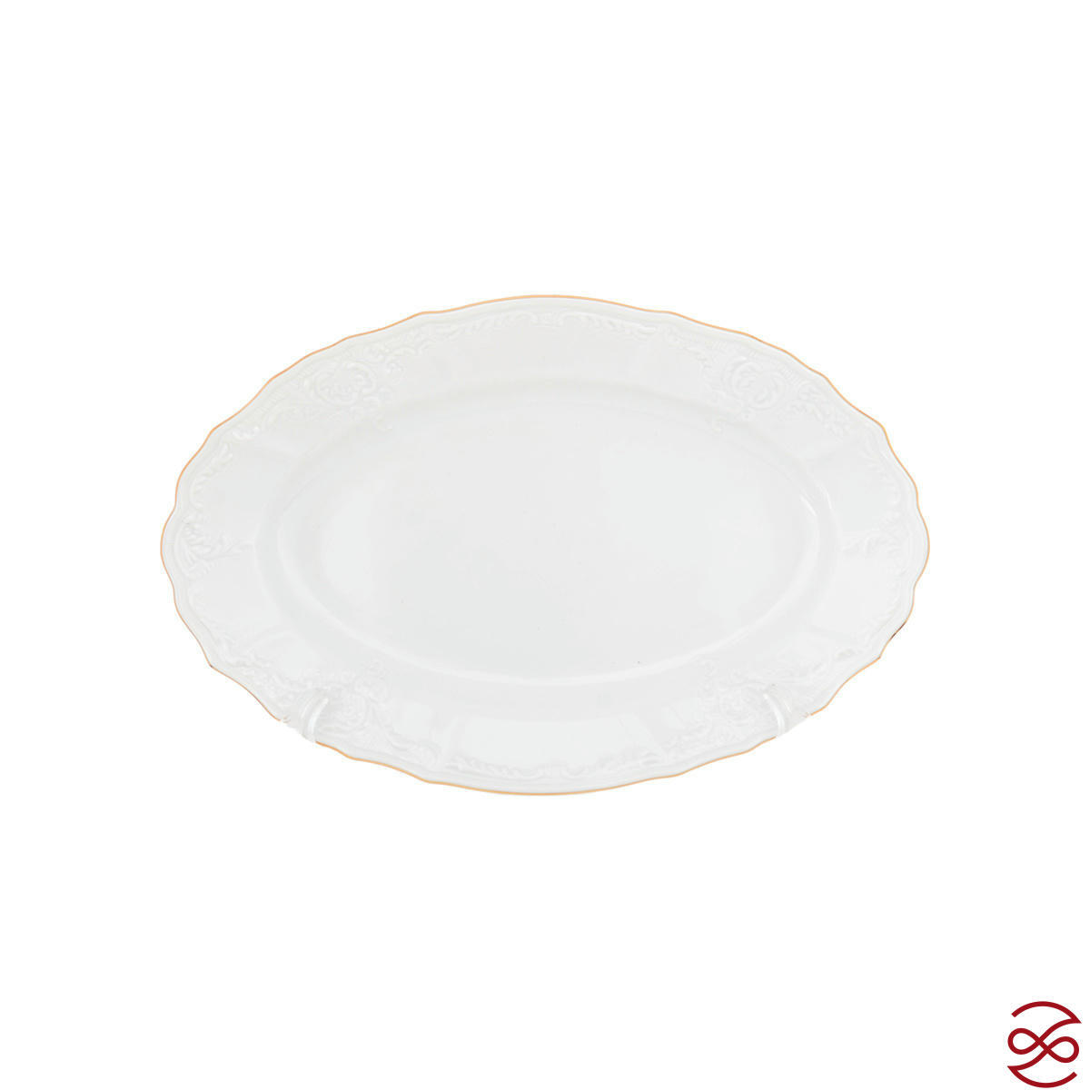 Оригинальная и высококачественная продукция – это то, что можно сказать о серии фарфоровой посуды Bernadotte Белый узор. И представленное блюдо – яркое тому подтверждение! Чешское качество, тонкое тиснение, ажурный кант – это настоящая гармония, подчеркнутая золотом. Блюдо подойдет для подачи нарезки, выпечки, дичи и бутербродов, запеканок и пирогов. Диаметр изделия: 26 см.