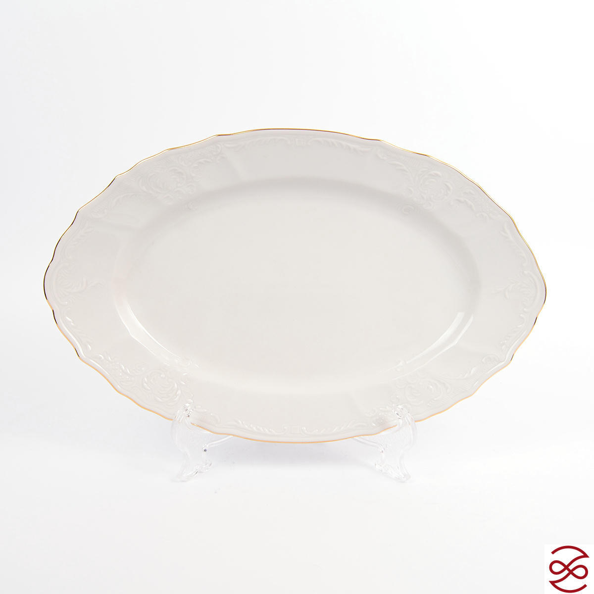 Оригинальная и высококачественная продукция – это то, что можно сказать о серии фарфоровой посуды Bernadotte Белый узор. Овальное блюдо для подачи выпечки, бутербродов, мясной или сырной нарезки – яркое тому подтверждение! Нежный фарфор с тиснением и золотая кайма создают тот неповторимый образ и шик, который несет в себе представленная коллекция.