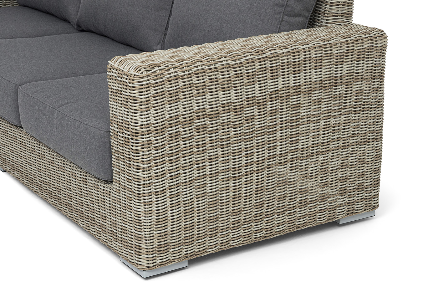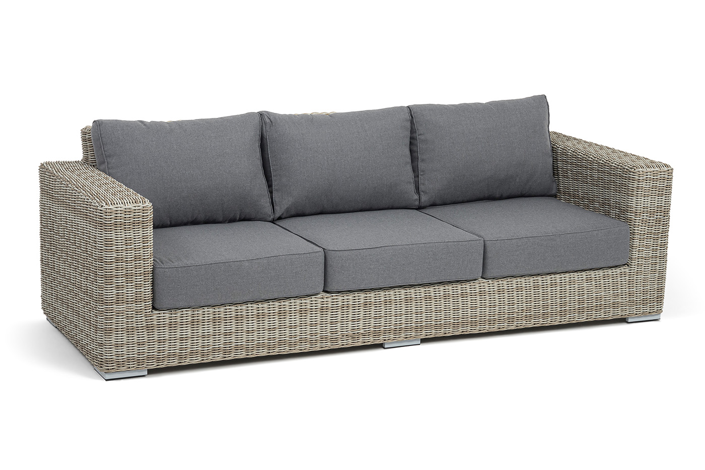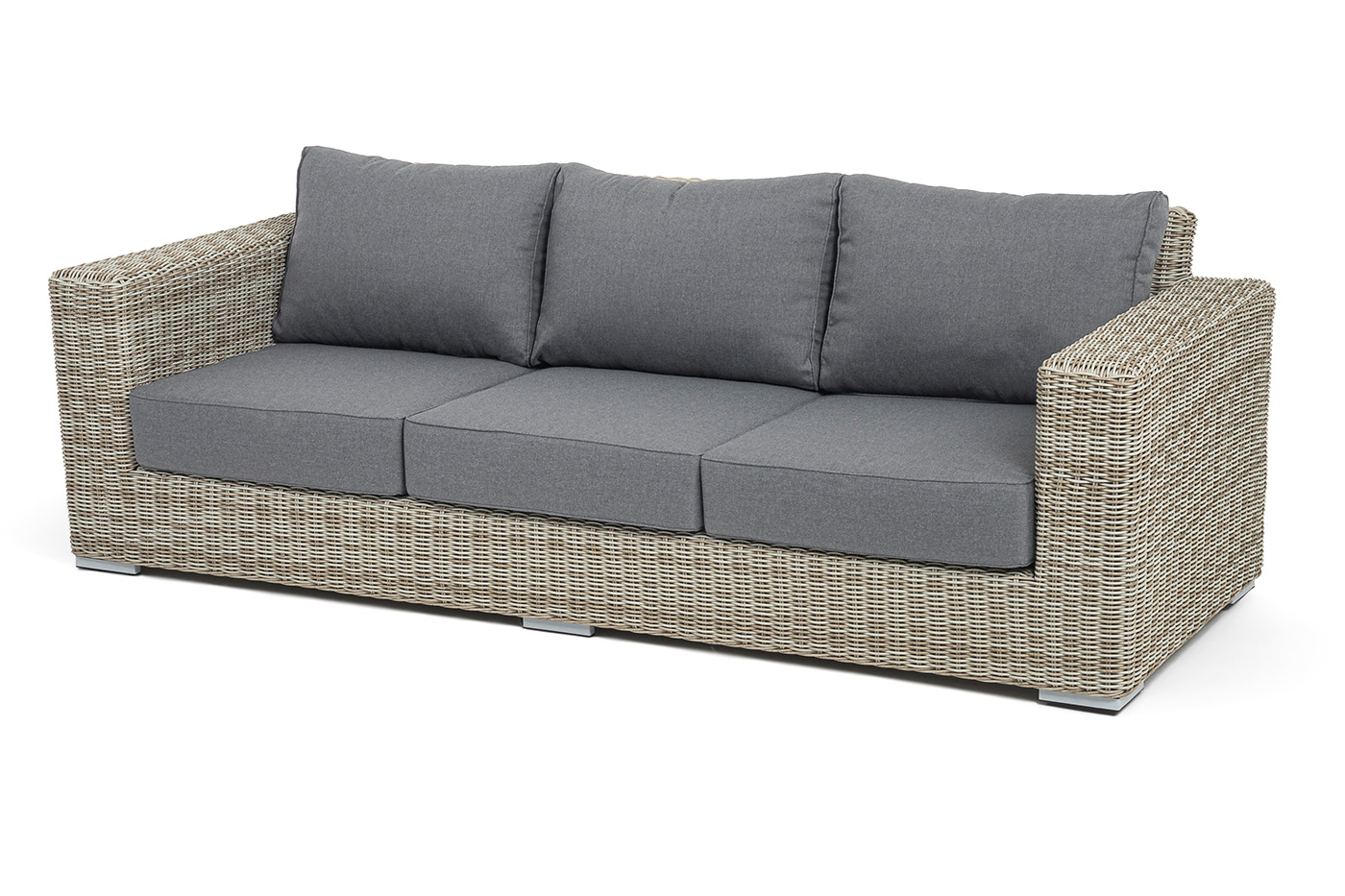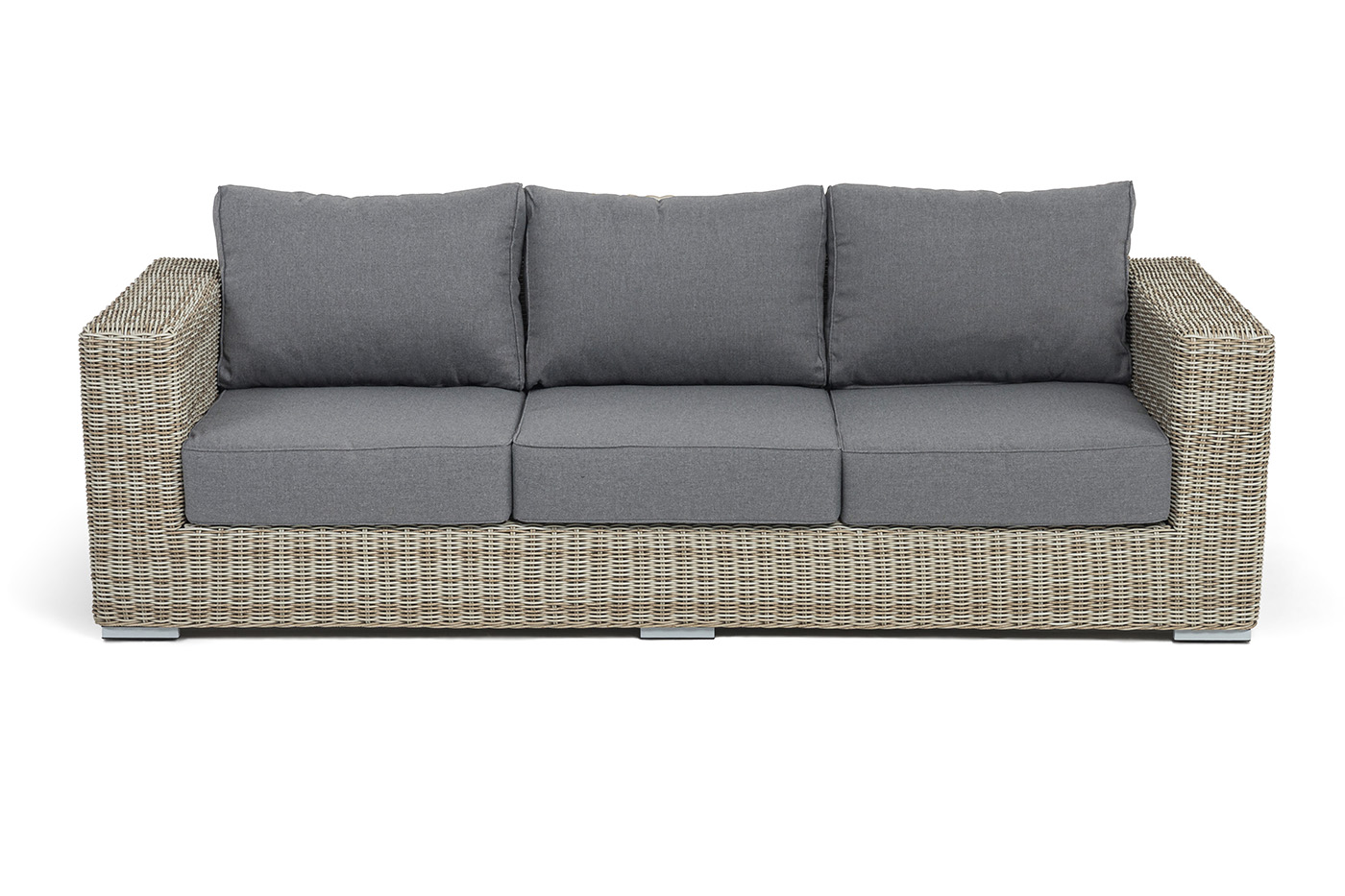 В комплекте с трехместным диваном идут мягкие подушки для комфортного расположения. Чехлы съёмные серого цвета из высококлассного полиэстера с плотностью 300гр/м2. Защитные свойства ткани усиливаются при помощи влагоотталкивающей пропитки.