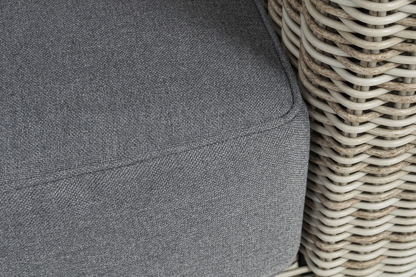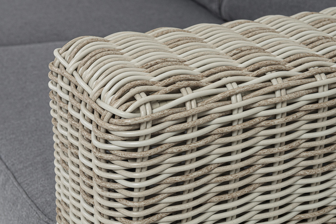 Ручное круглое плетение является основным декоративным элементом мебели. Оно выполнено из искусственного ротанга в бежевом цвете.