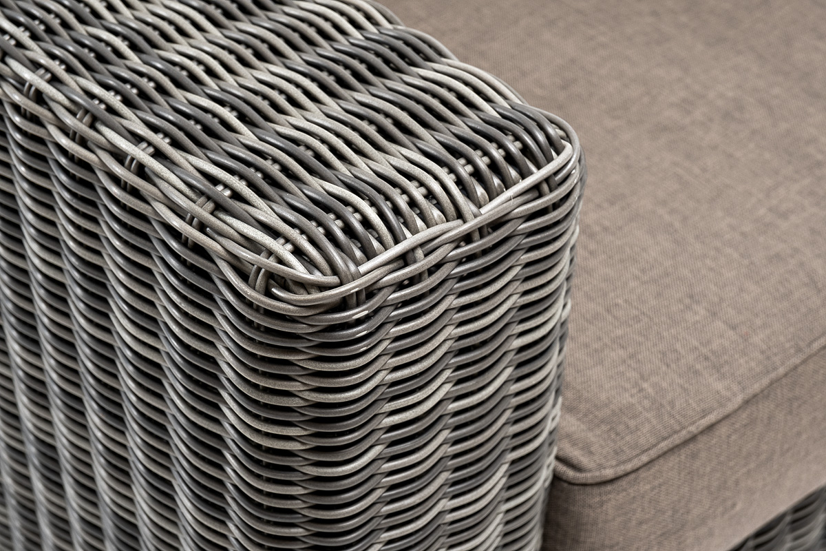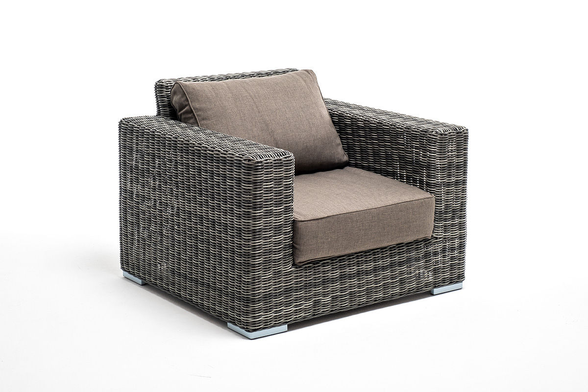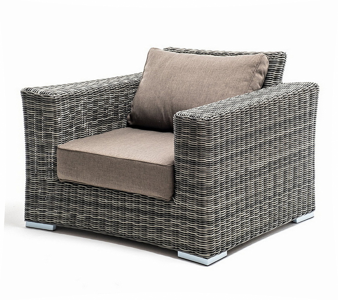 Кресло оснащено каркасом из прочного алюминия, ручное круглое плетение является основным декоративным элементом мебели. Оно выполнено из искусственного ротанга в графитовом цвете.