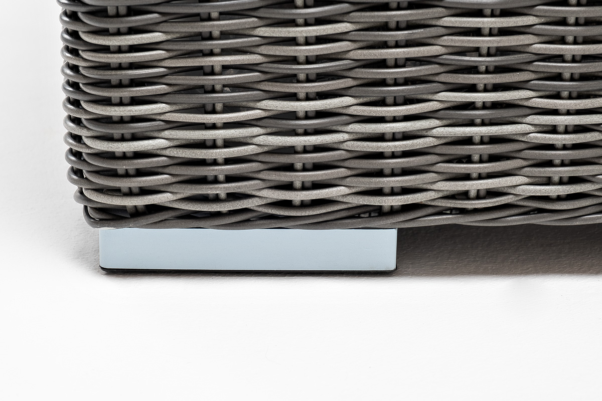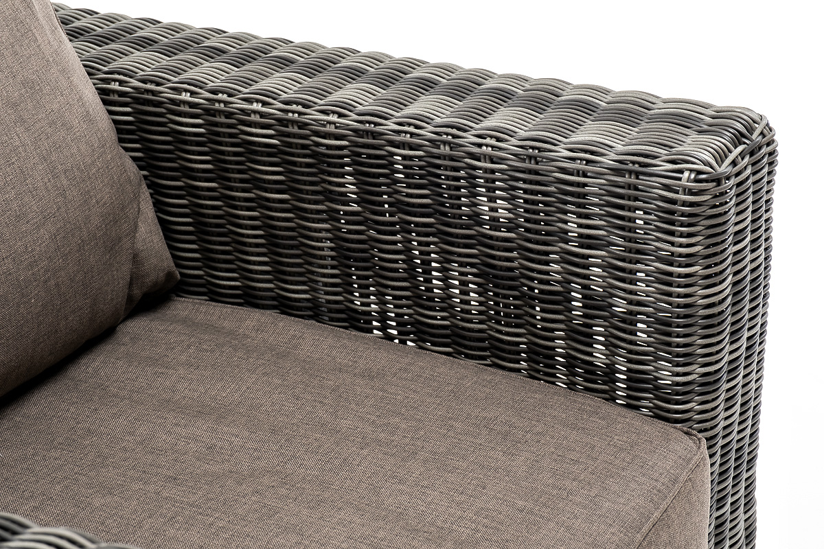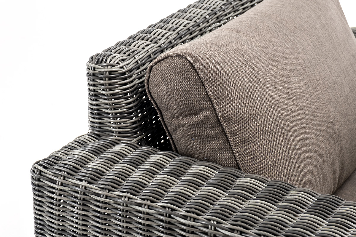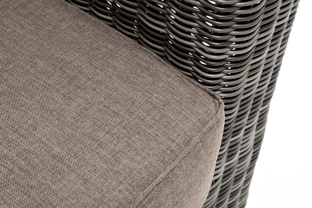 Кресло оснащено каркасом из прочного алюминия, ручное круглое плетение является основным декоративным элементом мебели. Оно выполнено из искусственного ротанга в графитовом цвете.