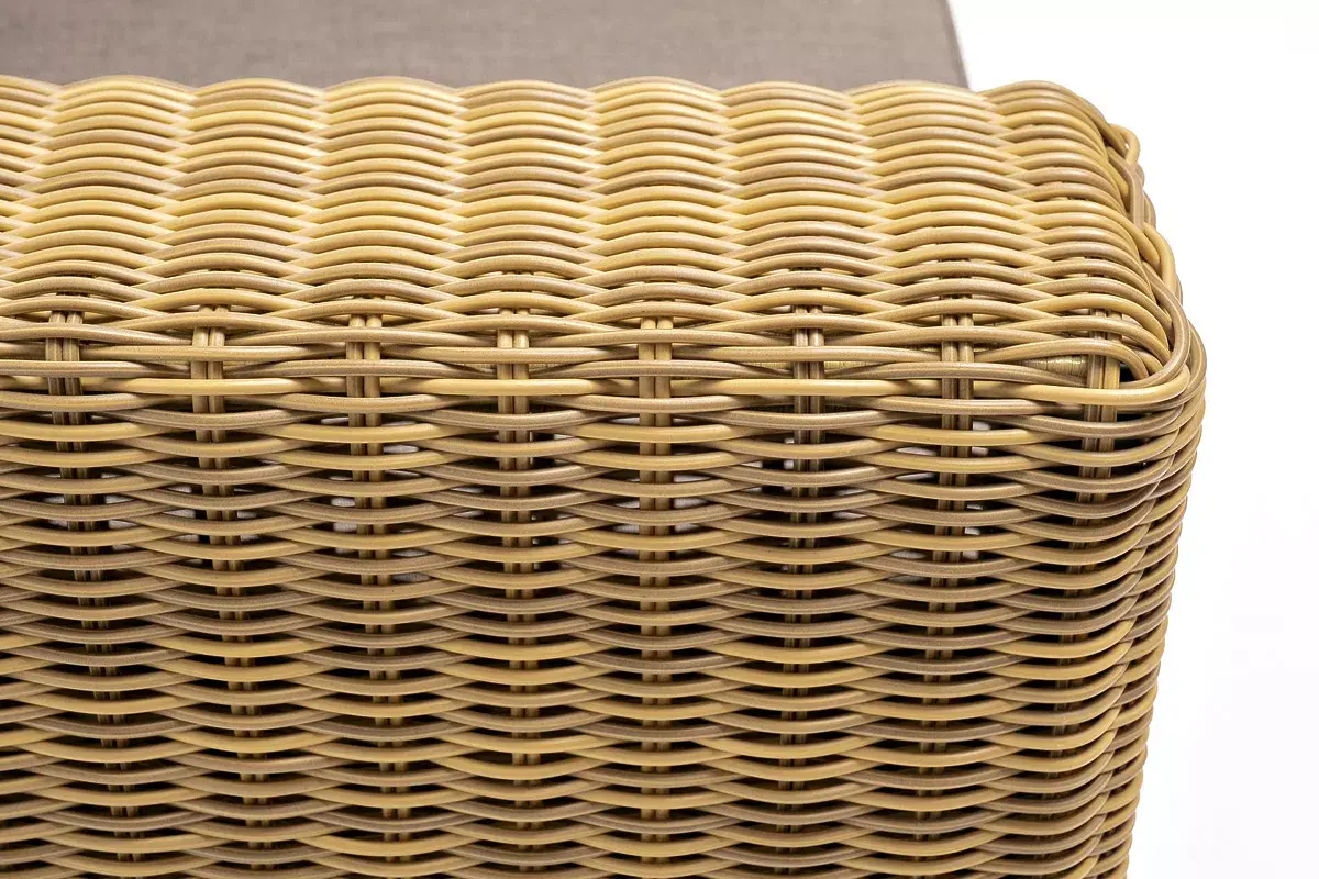 Кресло оснащено каркасом из прочного алюминия, ручное круглое плетение является основным декоративным элементом мебели. Оно выполнено из искусственного ротанга в соломенном цвете.