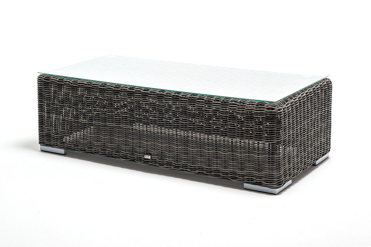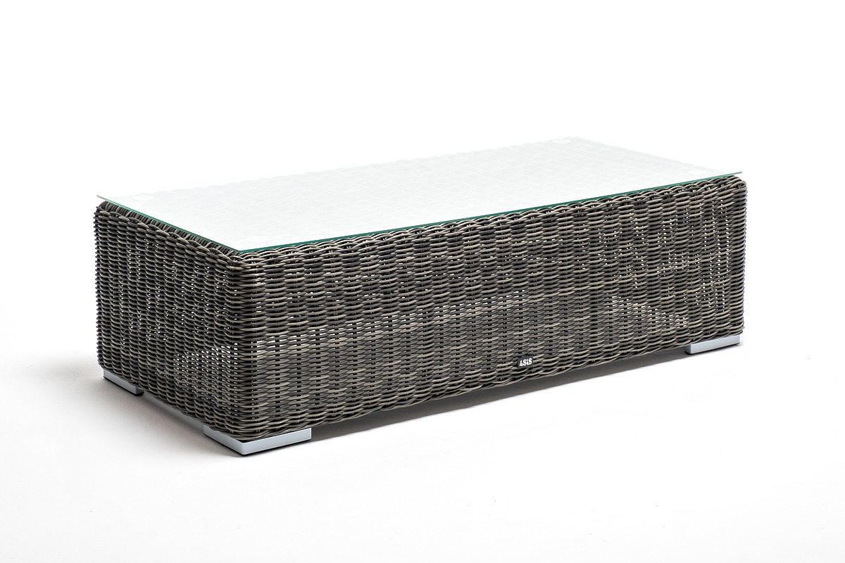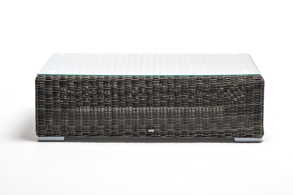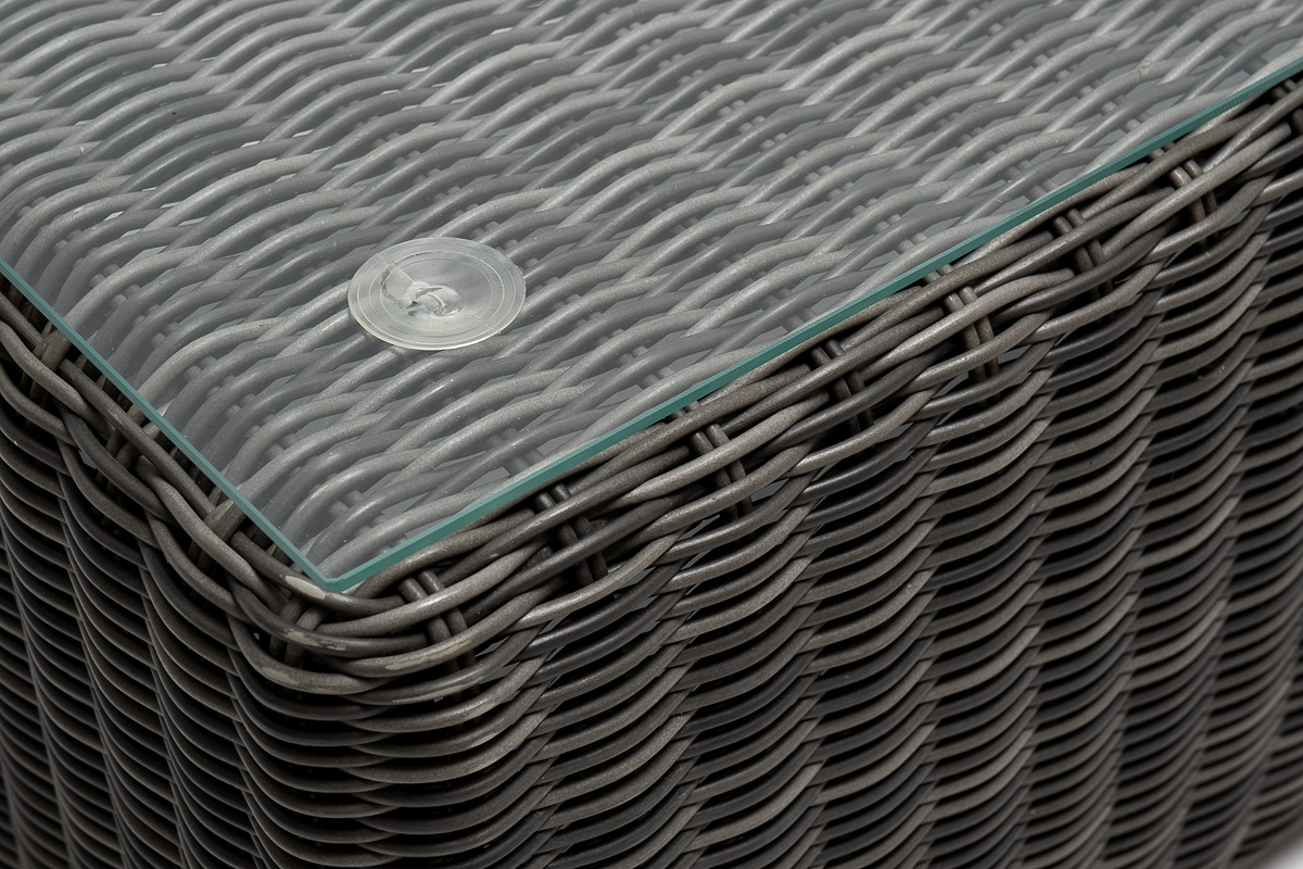 Каркас столика изготовлен из алюминия, вручную оплетенного круглым искусственным ротангом.