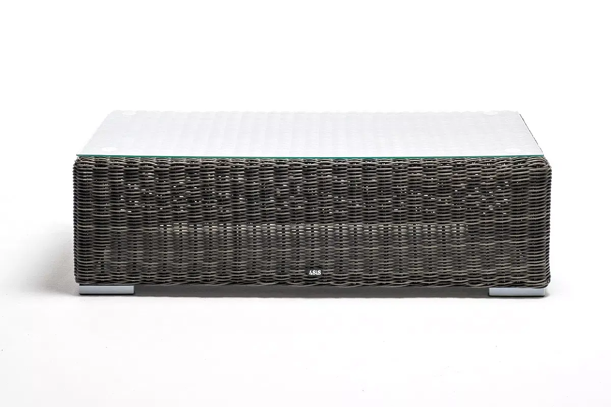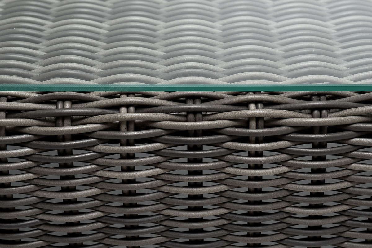 Каркас столика изготовлен из алюминия, вручную оплетенного круглым искусственным ротангом.