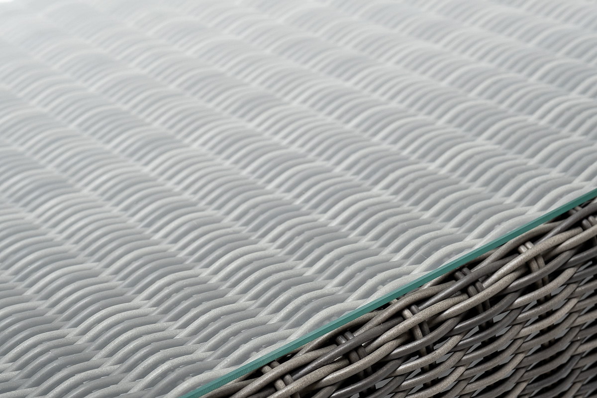 Столешница из закаленного стекла толщиной 5 мм. Благодаря износостойким материалам, стол пригоден для использования на улице при любой погоде и не требует специальных условий хранения.