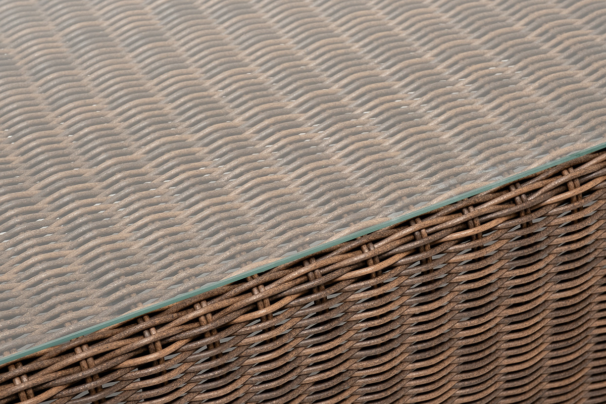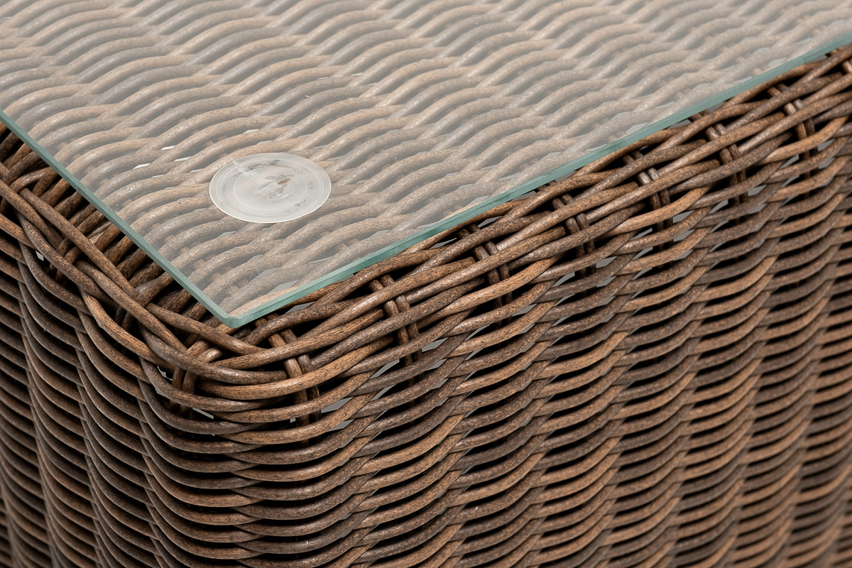 Каркас столика изготовлен из алюминия, вручную оплетенного круглым искусственным ротангом.