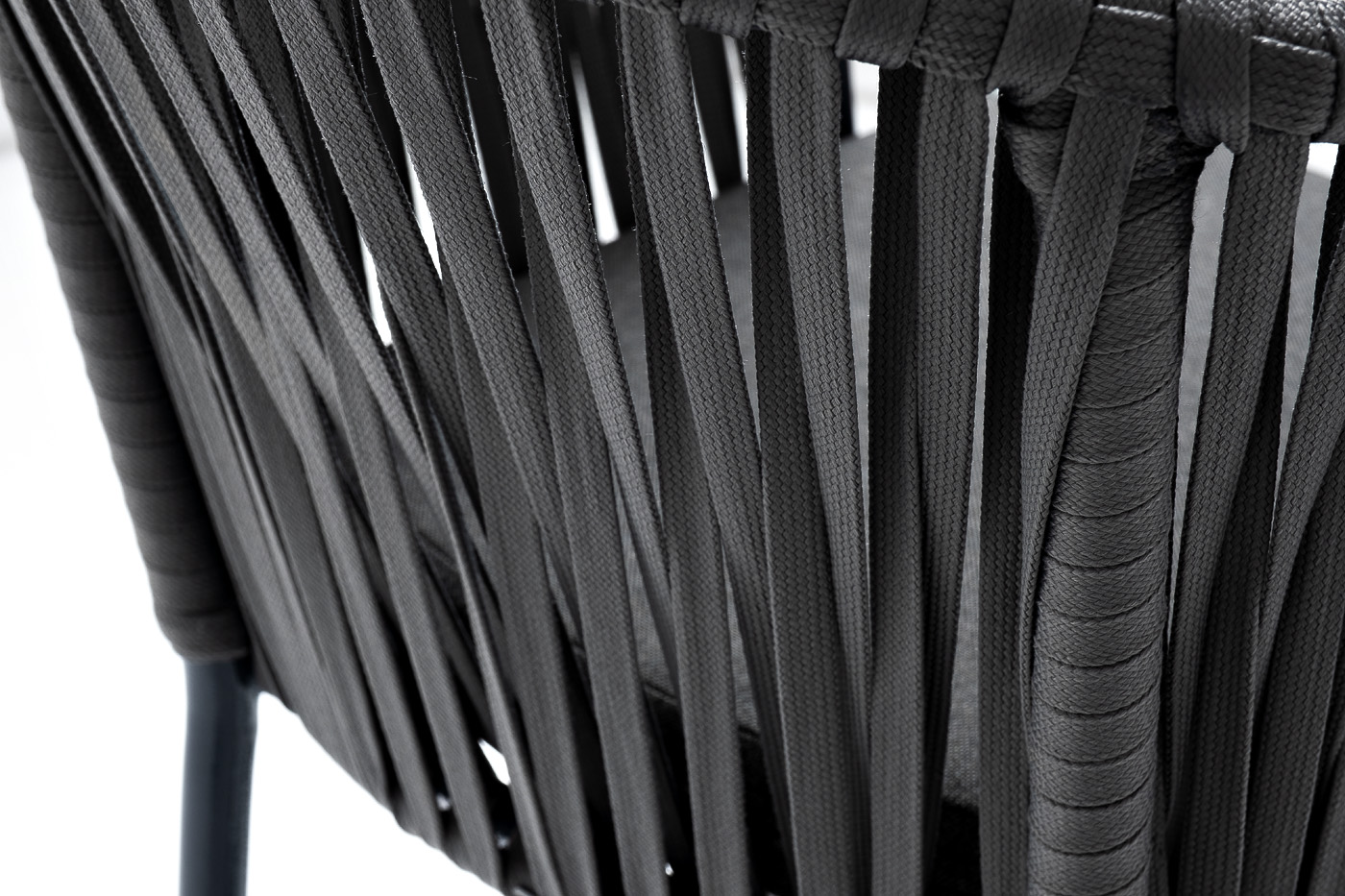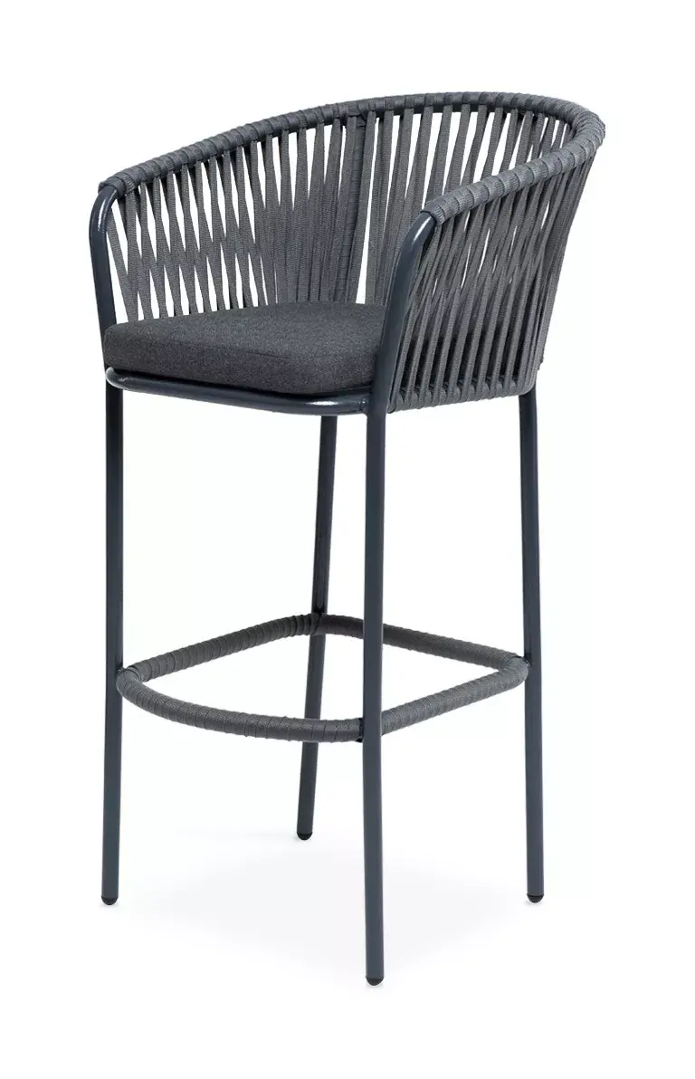 Барный стул «Бордо» представлен в стальном каркасе темно-серого цвета. Оплетен вручную эластичными синтетическими лентами из высокопрочных полиэфирных волокон серого цвета.