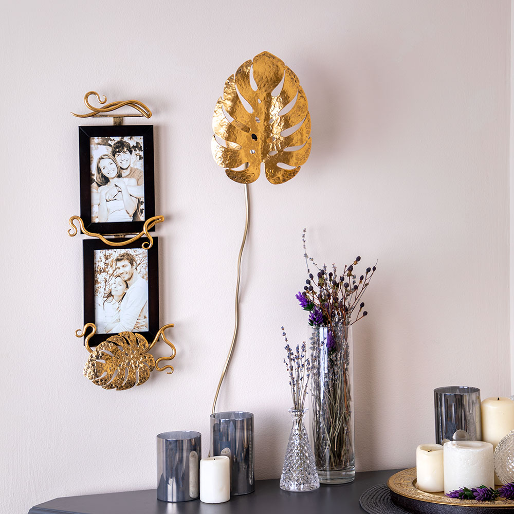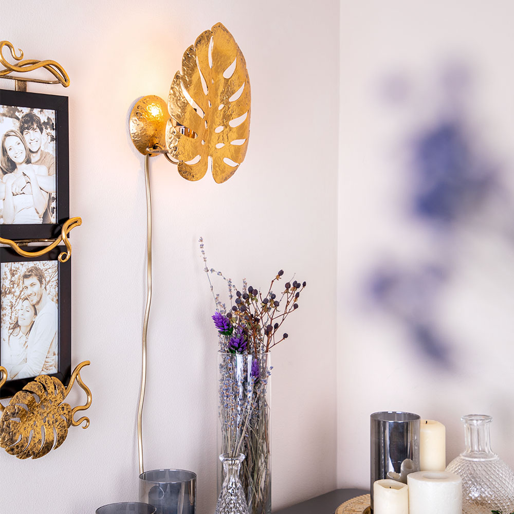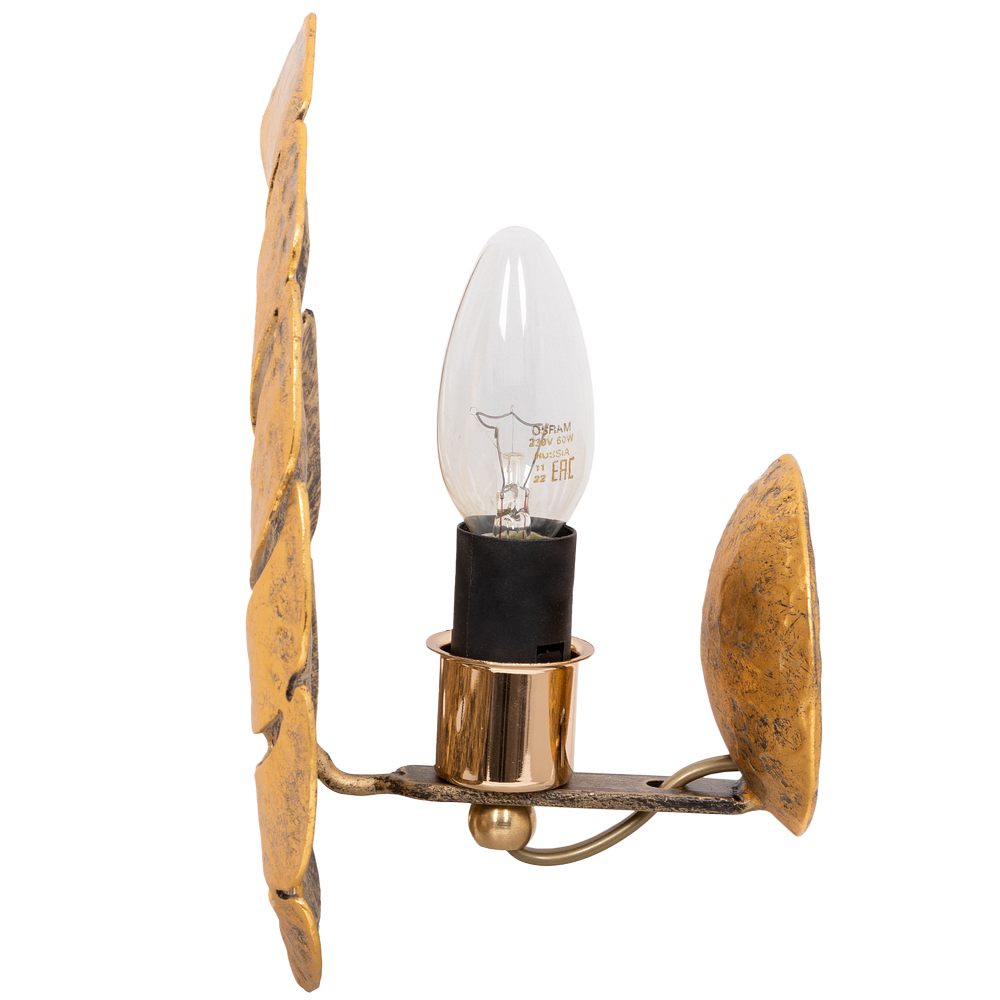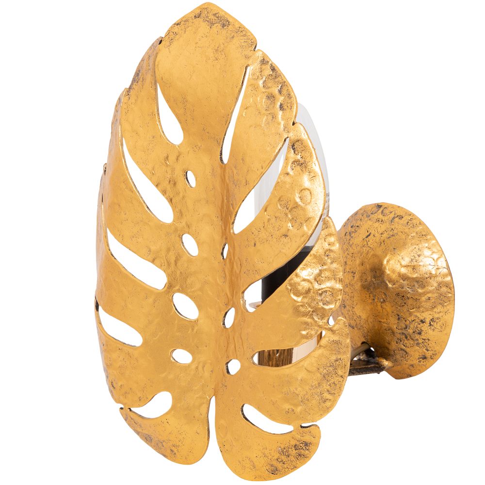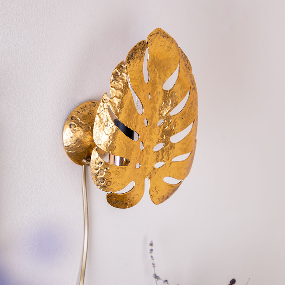 Светильник настенный Monstera DeliciosaДизайнерский настенный светильник – бра российской фабрики BOGACHO стильное решение для вашего дома и офиса. Рассеиватели эффектно разбивают лучи света, мягко освещая комнату. Известно, что вертикальные поверхности в большей степени притягивают наш взгляд в интерьере. Поэтому настенный декор все больше приобретает сейчас популярность.Коллекция подвесных настенных светильников Монстера выглядит действительно оригинально. Сразу привлекают необычные формы, функциональность и универсальные оттенки. Подходит настенный светильник для спальни в качестве прикроватного светильника. В любой комнате, где недостаточно центрального света или хочется добавить больше лоска, светильники настенные бра Monstera обеспечат качественную подсветку. Декоративный светильник можно использовать для усиления основного источника освещения, для создания спокойной, романтической обстановки или для зонирования пространства. Люстра настенная будет отлично смотреться в детской возле кровати как ночник, в коридоре рядом с зеркалом как подсветка.Подвесные светильники настенные бра представляют собой листья монстеры и выполнены полностью вручную методом горячей ковки, позолочены мастерами фабрики. Фактурные детали настенного светильника бра не только украшают комнату, но и формируют необычайно красивую игру света. Оригинальные светильники подвесные гармонично смотрятся в интерьере, Они сделают дизайн более актуальным и непохожим на другие. В качестве источников света можно выбрать светодиодные или лампы накаливания со стандартным цоколем Е14. Лампа и все крепежи для монтажа подвесного светильника на стену поставляются в комплекте. Длина провода 2 м.
