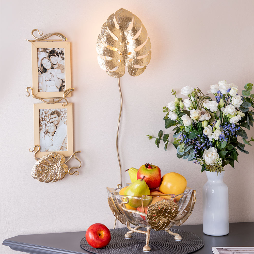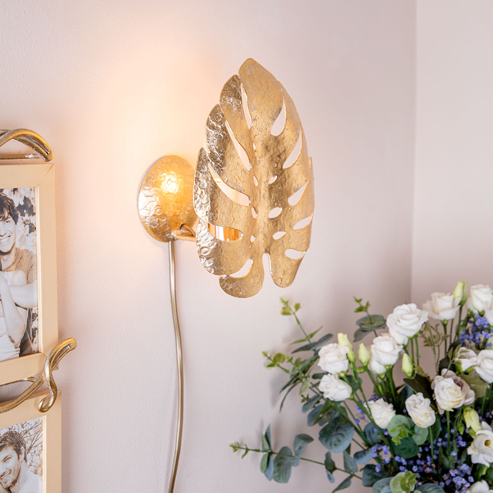 Светильник настенный Monstera DeliciosaДизайнерский настенный светильник – бра российской фабрики BOGACHO стильное решение для вашего дома и офиса. Рассеиватели эффектно разбивают лучи света, мягко освещая комнату. Известно, что вертикальные поверхности в большей степени притягивают наш взгляд в интерьере. Поэтому настенный декор все больше приобретает сейчас популярность.Коллекция подвесных настенных светильников Монстера выглядит действительно оригинально. Сразу привлекают необычные формы, функциональность и универсальные оттенки. Подходит настенный светильник для спальни в качестве прикроватного светильника. В любой комнате, где недостаточно центрального света или хочется добавить больше лоска, светильники настенные бра Monstera обеспечат качественную подсветку. Декоративный светильник можно использовать для усиления основного источника освещения, для создания спокойной, романтической обстановки или для зонирования пространства. Люстра настенная будет отлично смотреться в детской возле кровати как ночник, в коридоре рядом с зеркалом как подсветка.Подвесные светильники настенные бра представляют собой листья монстеры и выполнены полностью вручную методом горячей ковки, позолочены мастерами фабрики. Фактурные детали настенного светильника бра не только украшают комнату, но и формируют необычайно красивую игру света. Оригинальные светильники подвесные гармонично смотрятся в интерьере, Они сделают дизайн более актуальным и непохожим на другие. В качестве источников света можно выбрать светодиодные или лампы накаливания со стандартным цоколем Е14. Лампа и все крепежи для монтажа подвесного светильника на стену поставляются в комплекте. Длина провода 2 м.