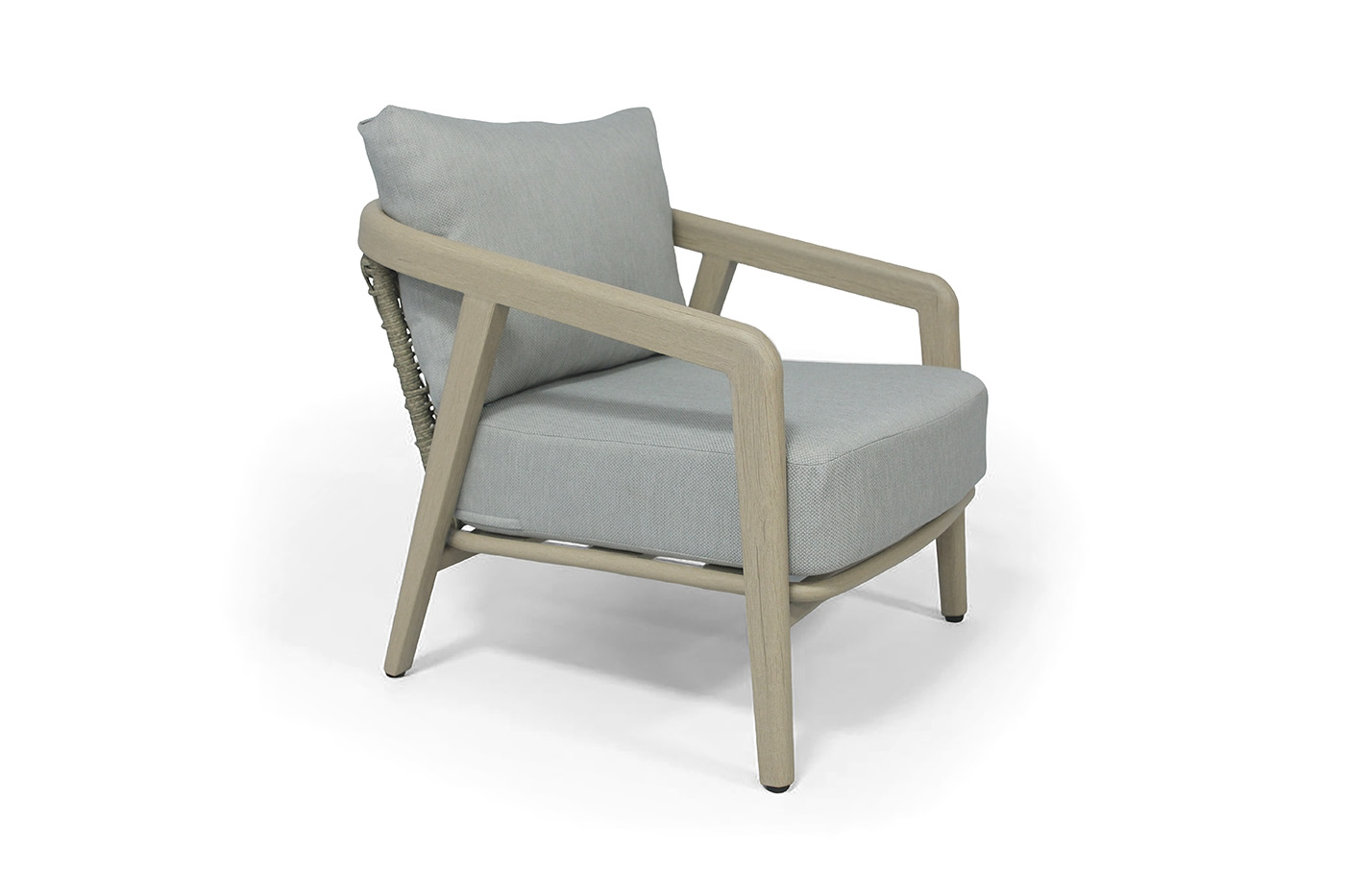 Прочный, но легкий алюминиевый каркас, стилизованный под холодное бежевое дерево - гарантирует долгий срок службы и надежность. Изящная оплетка из круглого искусственного ротанга серого цвета, напоминающая натуральное плетение, дарит неповторимую текстуру и приятные тактильные ощущения, создавая атмосферу мягкости и тепла.