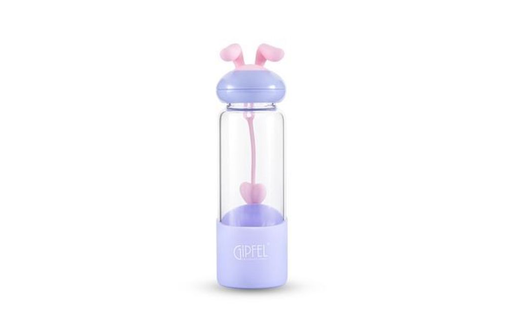 Бутылка для воды GIPFEL PAOLA 8325 объемом 350мл. Бутылка сделана из боросиликатного стекла. На пластиковой крышке расположены забавные заячьи ушки из силикона розового цвета. Также в комплекте идет силиконовый ремешок с сердечком на конце. Бутылка особенно придется по душе детям, ее удобно использовать каждый день, она не займет много места в рюкзаке или сумке. Дно имеет съемную силиконовую противоскользящую накладку фиолетового цвета.