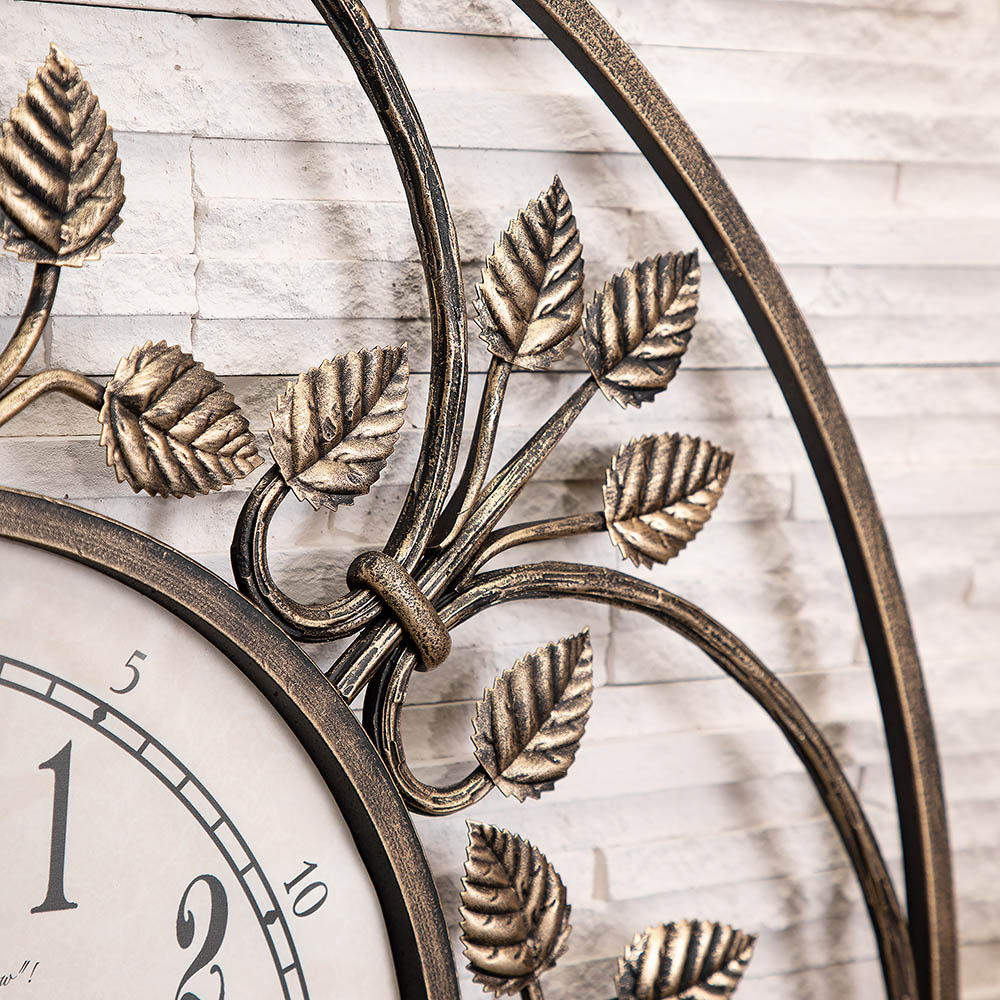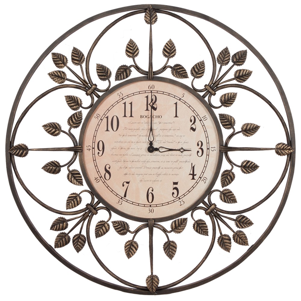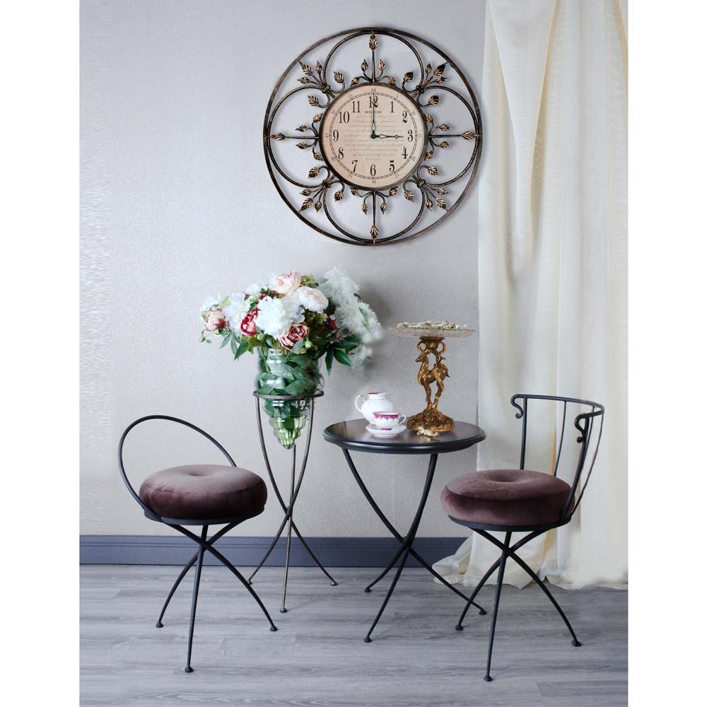 Настенные часы с открытым циферблатом (без стекла), механизм кварцевый. Часы выполнены вручную и могут иметь небольшие отличия по форме, цвету, размеру. Именно поэтому изделия с элементами художественной ковки имеют более высокую художественную ценность. Согласно философии фен-шуй металл символизирует финансовый успех, богатство и изобилие.