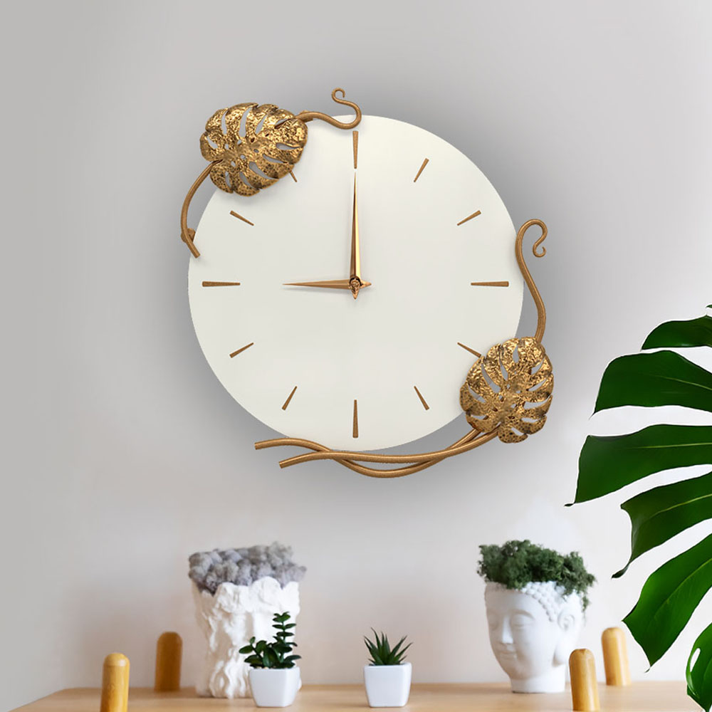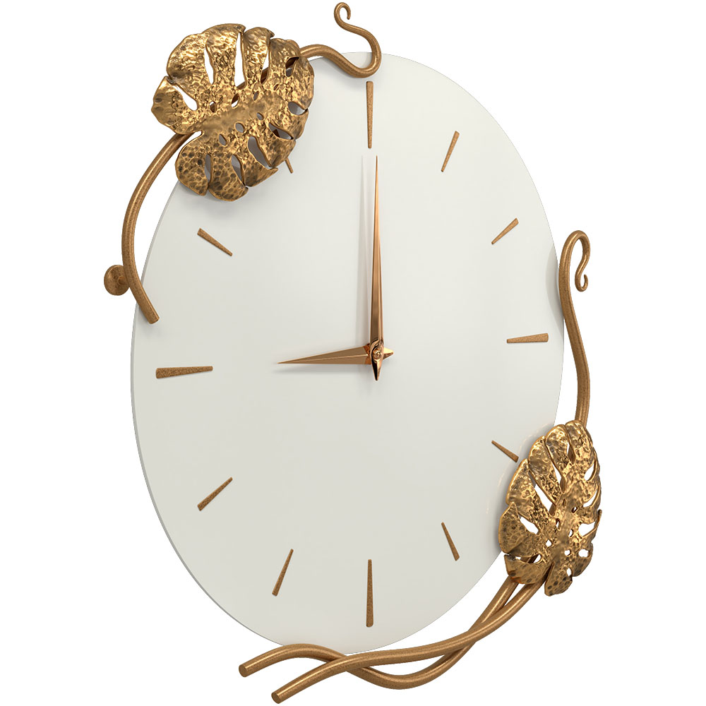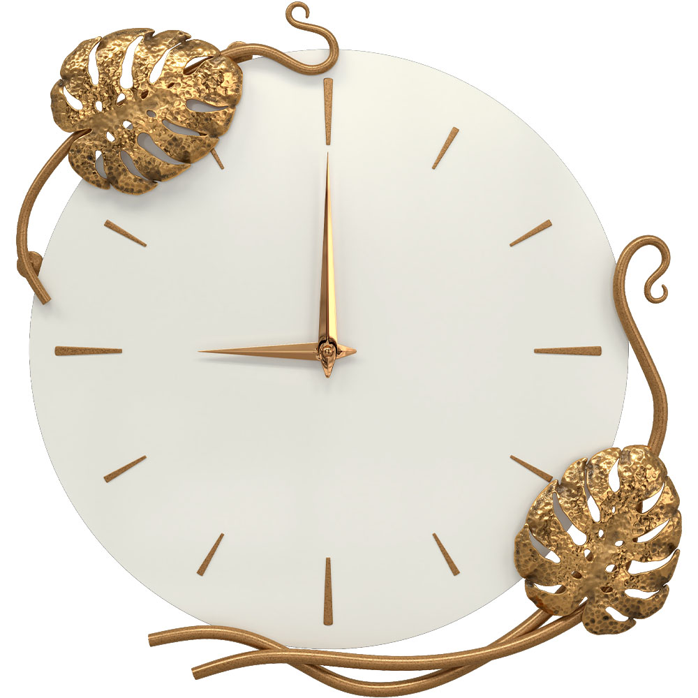 Благодаря бесшумному часовому механизму часы можно разместить в детской комнате, звук стрелки не будет мешать сну малышей. Декор часов представляют собой переплетенные листья монстеры и выполнены полностью вручную методом горячей ковки, позолочена мастерами фабрики. Настенные часы просты в уходе, нужно только иногда менять батарейки, в отличие от механических часов, где нужно регулярно заводить часовой механизм.