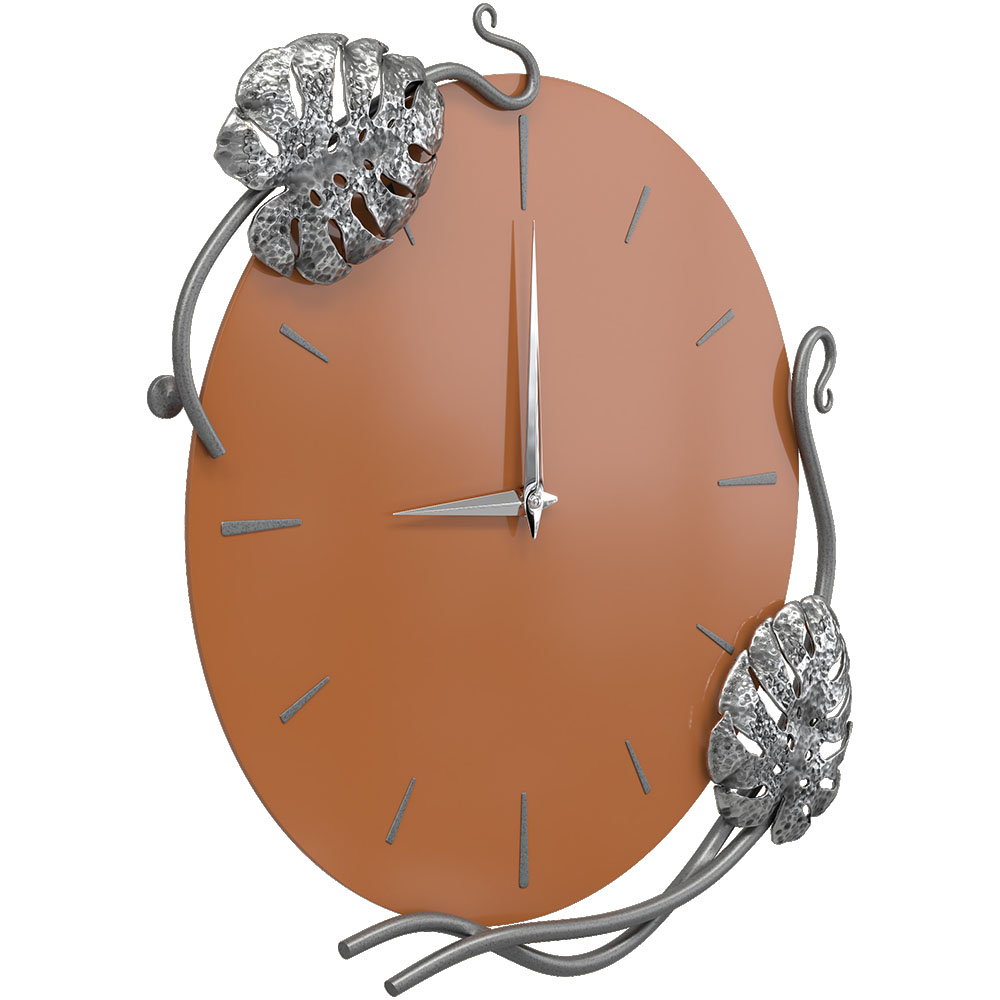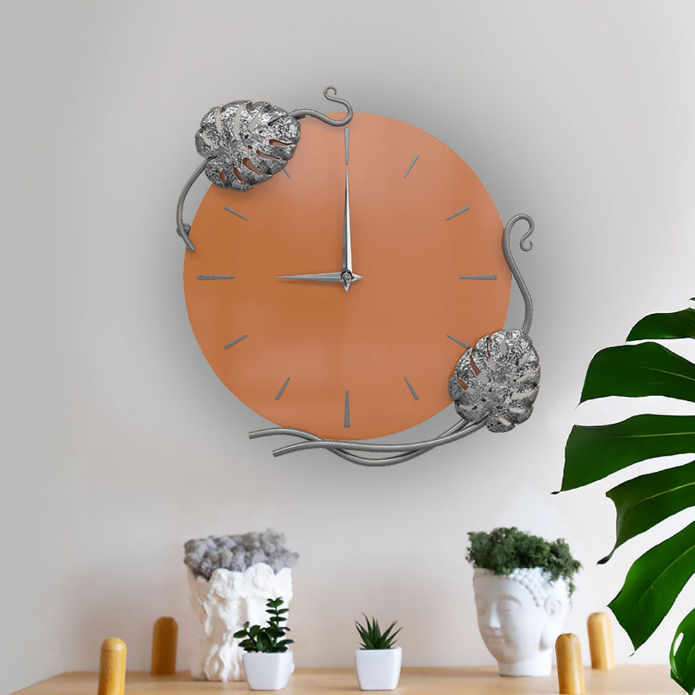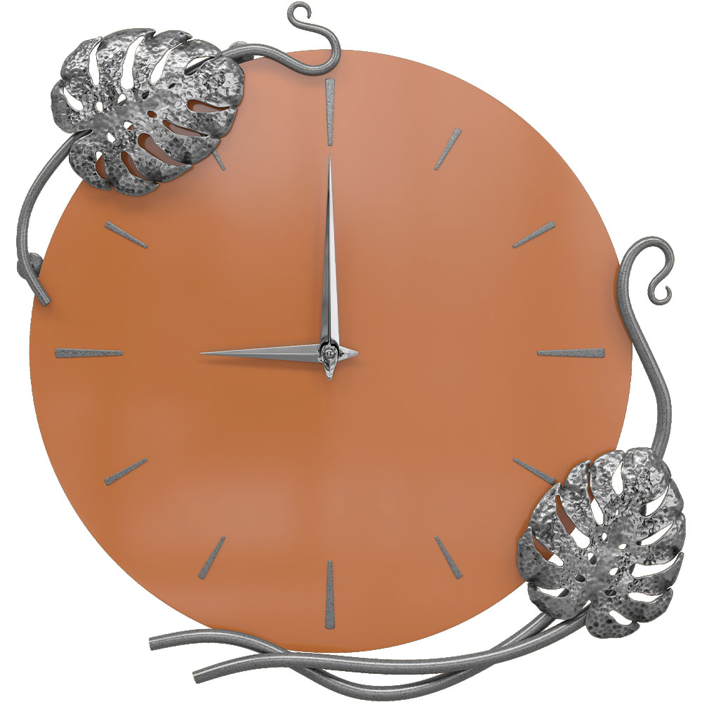 Благодаря бесшумному часовому механизму часы можно разместить в детской комнате, звук стрелки не будет мешать сну малышей. Декор часов представляют собой переплетенные листья монстеры и выполнены полностью вручную методом горячей ковки, позолочена мастерами фабрики. Настенные часы просты в уходе, нужно только иногда менять батарейки, в отличие от механических часов, где нужно регулярно заводить часовой механизм.