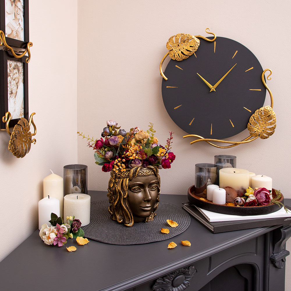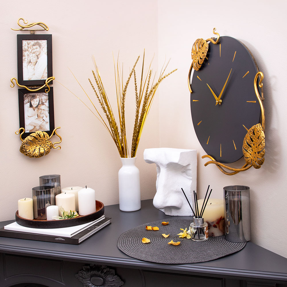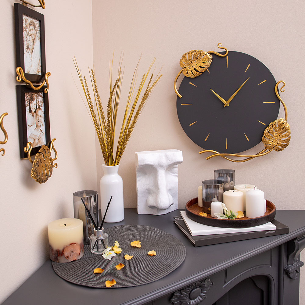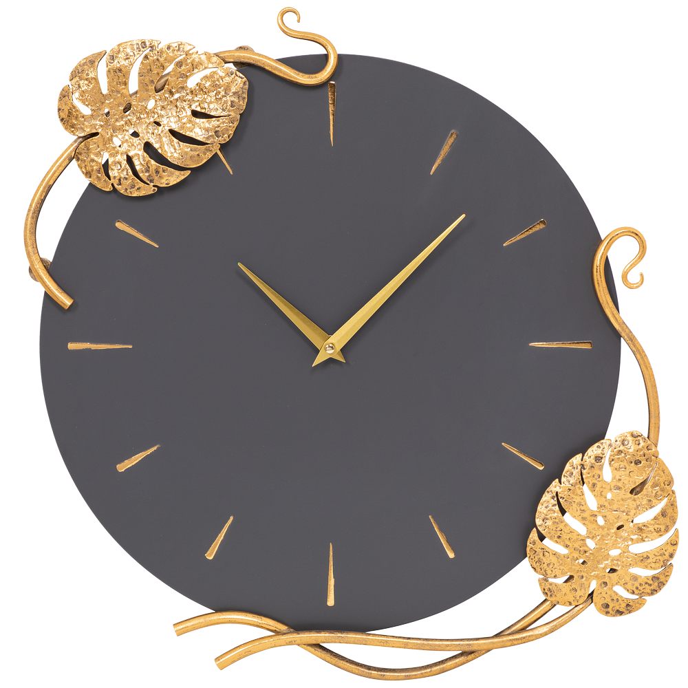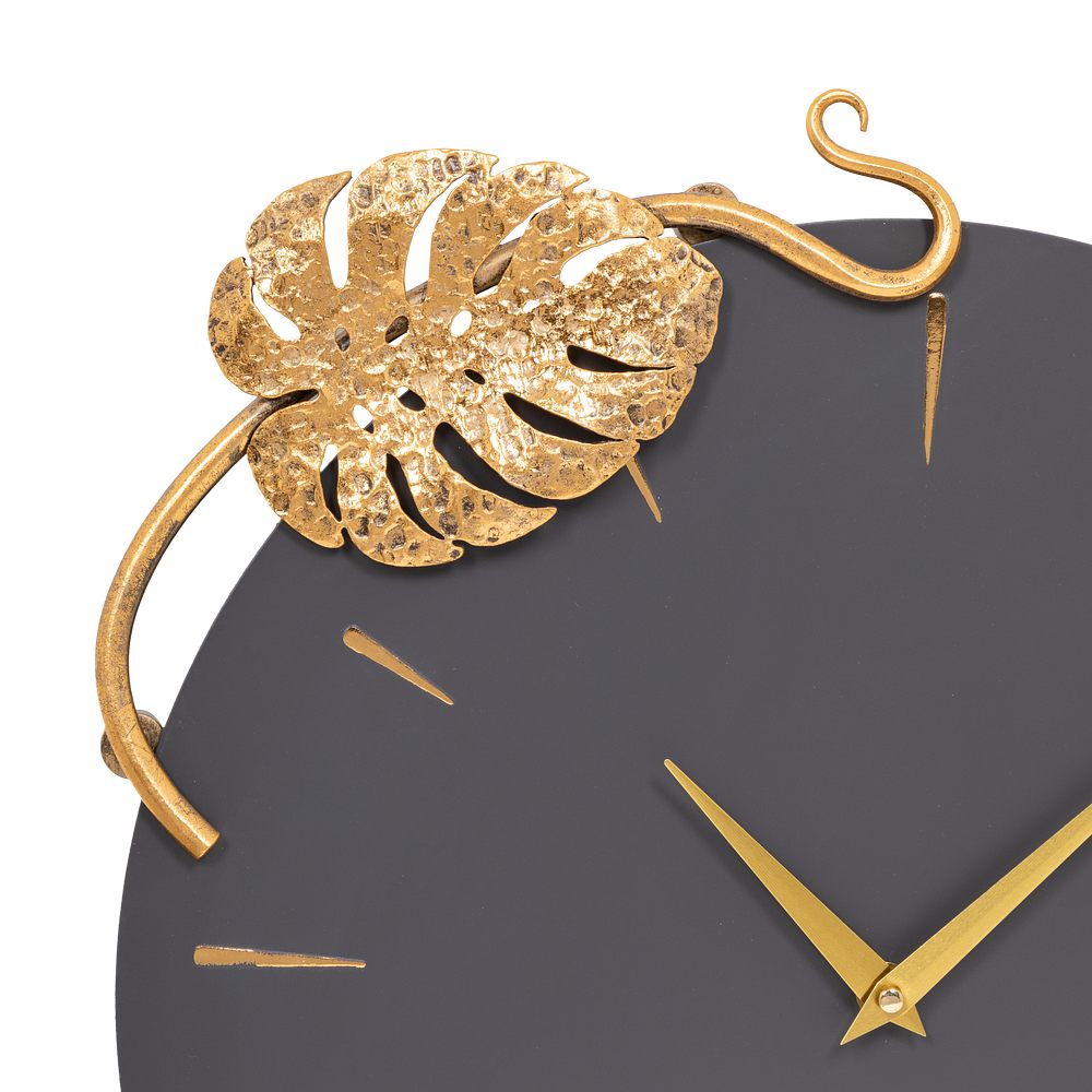 Благодаря бесшумному часовому механизму часы можно разместить в детской комнате, звук стрелки не будет мешать сну малышей. Декор часов представляют собой переплетенные листья монстеры и выполнены полностью вручную методом горячей ковки, позолочена мастерами фабрики. Настенные часы просты в уходе, нужно только иногда менять батарейки, в отличие от механических часов, где нужно регулярно заводить часовой механизм.