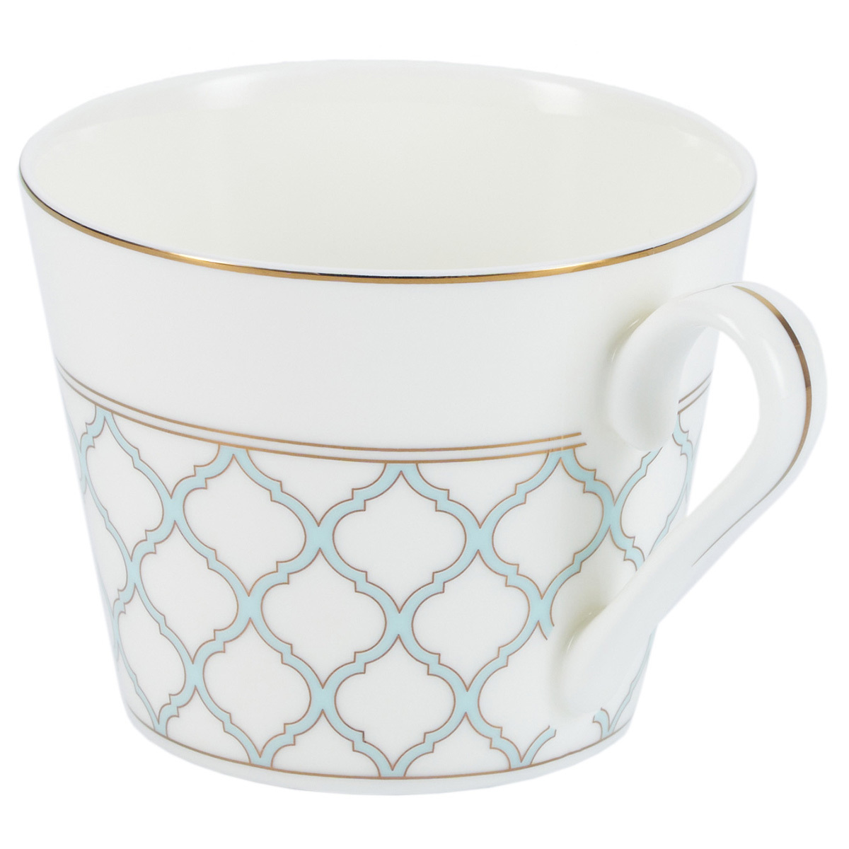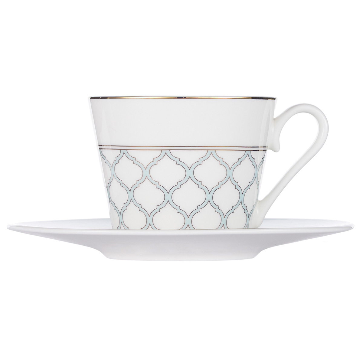 Чайная пара Gipfel Aurora 42867: чашка 250 мл и блюдце 16 см из костяного фарфора белого цвета с ажурным голубым узором в золоте.
