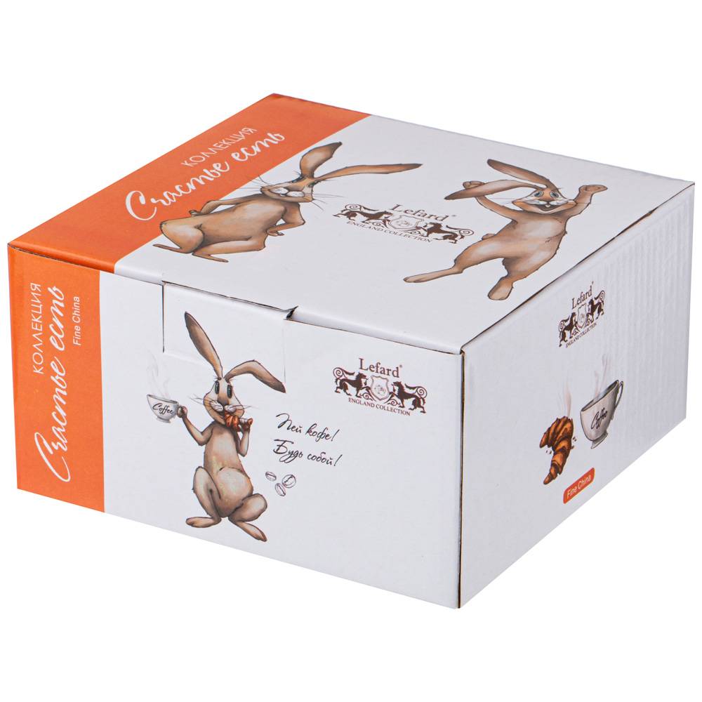Всем, кто полон энергии и задора, любит кофе и следит за фигурой посвящается коллекция «Счастье есть» от ТМ LEFARD. Это лучший подарок детям, родителям, друзьям и коллегам. Поднимайте настроение вместе с веселыми кроликами, верьте, Счастье есть! Кружки, чайные пары, стаканы с силиконовыми крышками, банки для кофе, тарелки и салатники выполнены на тонкостенном высококачественном фарфоре. Удобные формы и размеры. Красочная упаковка. Продукция прошла сертификацию, безопасна для контакта с пищевыми продуктами. Можно использовать в микроволновой печи, мыть в посудомоечной машине.
