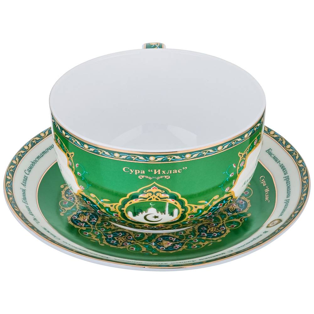 ТМ LEFARD представляет эксклюзивную коллекцию посуды «Суры из Корана». Кувшины, чайники, сахарницы, кружки, чайные пары, декоративные тарелки и другие предметы выполнены из высококачественного тонкостенного фарфора. Восточный орнамент, небольшие отрывки Сур из Корана на классическом арабском и русском языках с отделкой золотом украшают изделия. Это прекрасный мусульманский подарок, всегда нужный и теплый. Относитесь к нему бережно и с почтением. Посуду коллекции можно использовать как в повседневной жизни, так и на торжественном приеме. Не рекомендуется мыть в посудомоечной машине и использовать в микроволновой печи.