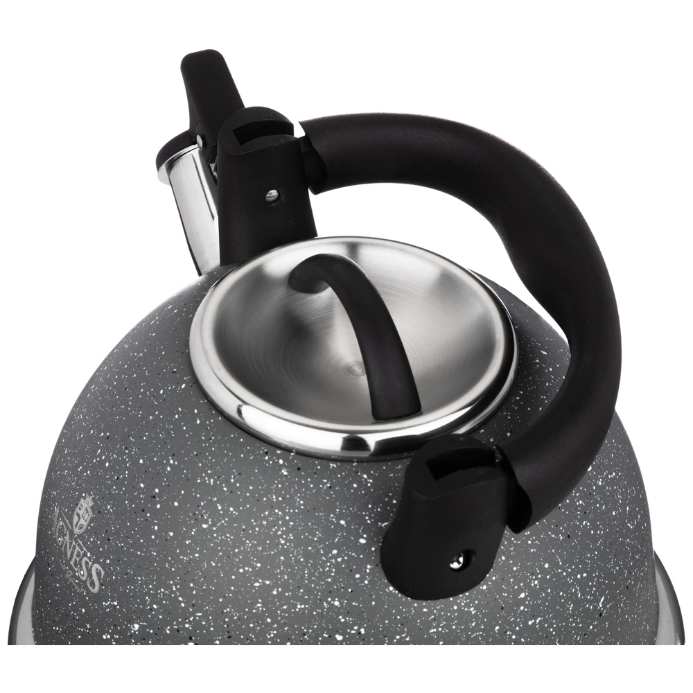Благодаря пластиковой вставке чайник удобно переносить, а встроенный свисток подскажет, что вода в чайнике закипела и его пора снимать с плиты.