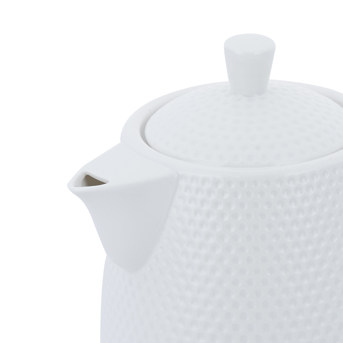 Изготовлен из белой жаропрочной керамики. Подставка у чайника из пластика.