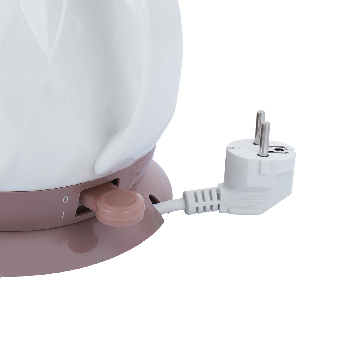 Изделие выполнено в классической форме, рельефный корпус белого цвета с ромбовидным орнаментом. Основание и подставка у чайника гладкие, матового розового-коричневого цвета.