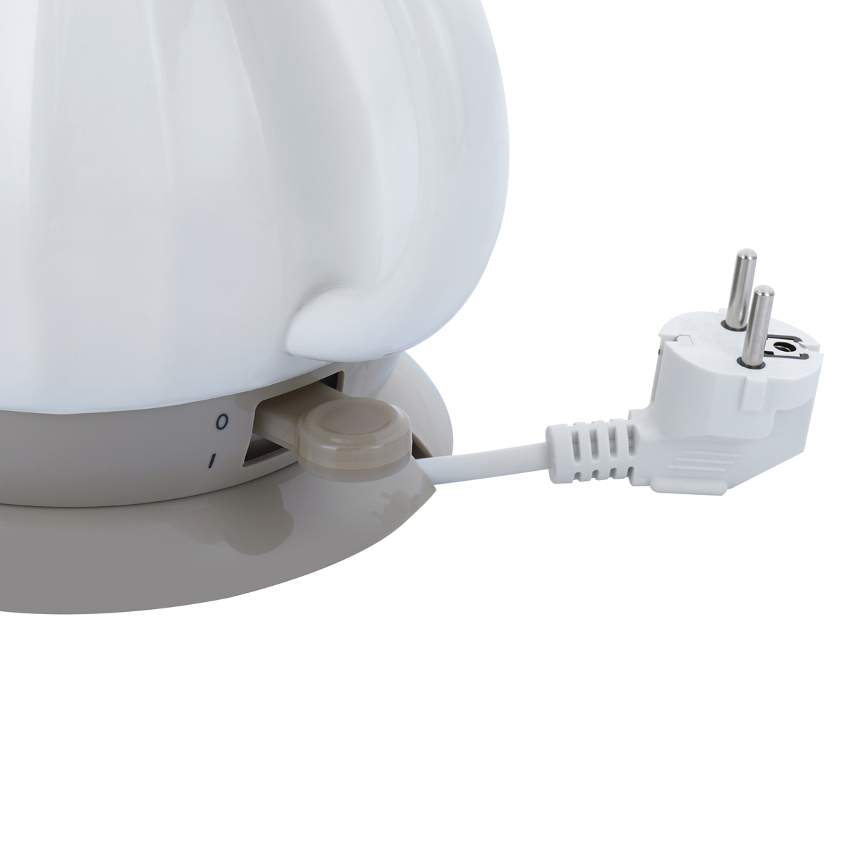 Электрочайник подключается к сети при помощи шнура — в поддоне для него предусмотрен отсек. Длина шнура 72 см. Прибор рассчитан на напряжение 220 В и мощность 1200 Вт. Для безопасного использования устройства в нем есть опция автоматического отключения — после закипания воды устройство само прекращает работу.