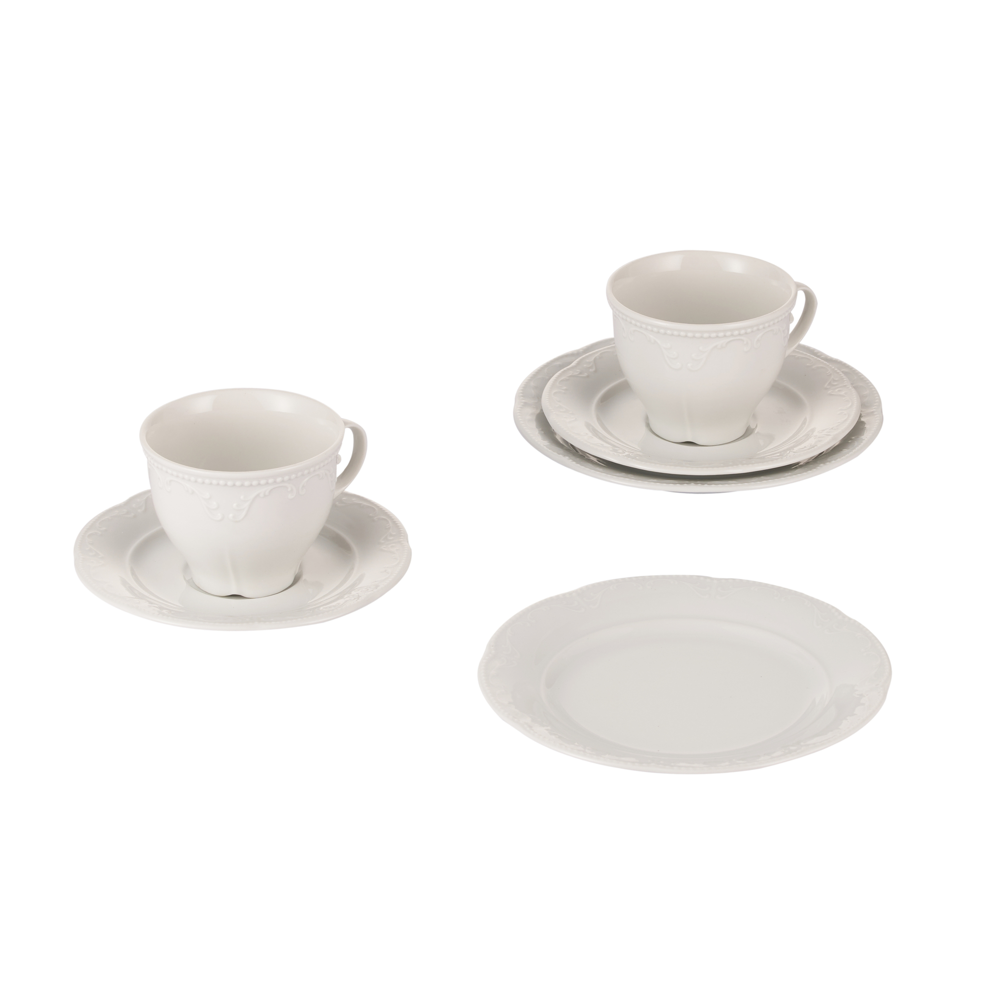 Набор чайный CAPRICE из 6 предметов. В наборе две чашки по 220мл чашки, две тарелки по 17см, два блюдца по 16см. Набор выполнен из белого фарфора с ажурным цветочным рисунком.