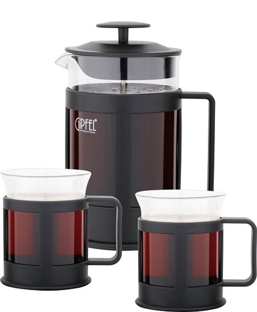 Чайный набор GIPFEL GLACIER-SEVILLA 7440 с френч-прессом. Набор состоит из 3-х предметов: френч-пресс 800мл и 2 чашки по 200мл. Набор выполнен из жаропрочного боросиликатного стекла с элементами из нержавеющей стали. Внешние детали сделаны из пластика.