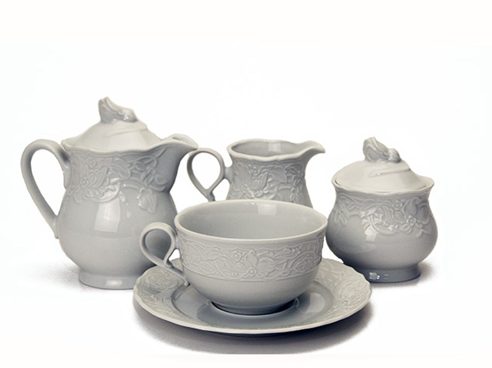 Набор чайный HELEN из 7 предметов. В наборе две чашки по 220 мл чашки, два блюдца по 17 см, чайник 360 мл, молочник 200 мл, сахарница 220 м л. Набор выполнен из белого фарфора с ажурным цветочным рисунком.