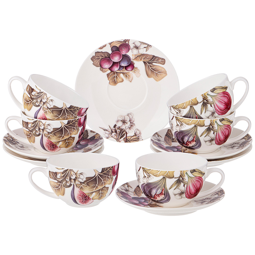 Продукция прошла сертификацию, безопасна для контакта с пищевыми продуктами. Можно использовать в микроволновой печи, мыть в посудомоечной машине. Комплектность: чашка 9,5/12 см, высота 6 см, объем 270 мл - 6 шт., блюдце 14 см - 6 шт.