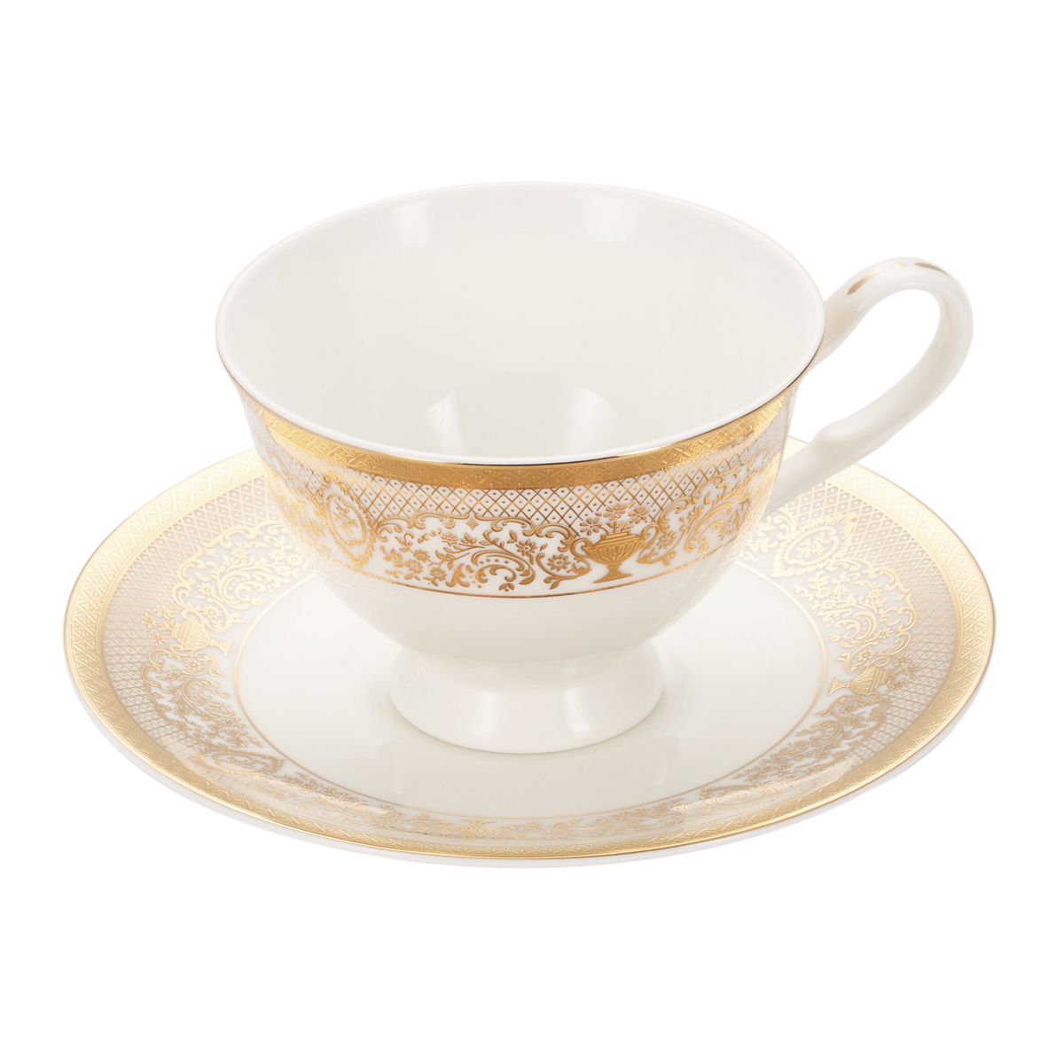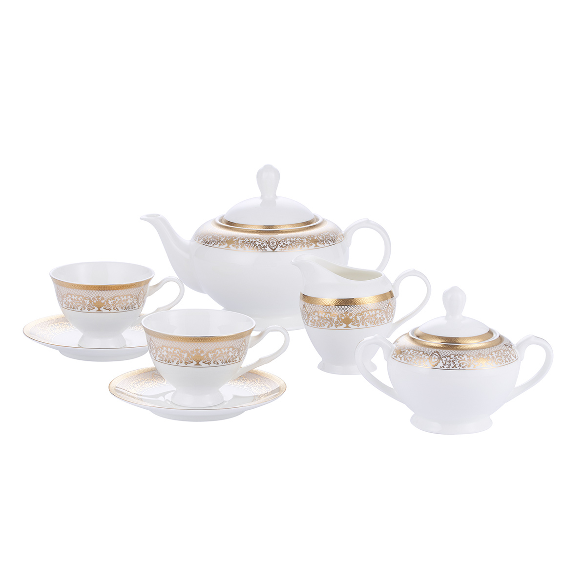 Сервиз чайный Gipfel ARGENTO 40982 на 6 персон из 15 предметов: чашка 200мл, 6шт., блюдце 16 см, 6шт., чайник заварочный, 1100мл, 1шт., молочник, 1 шт., сахарница, 1 шт. Цвет: белый с золотистым кантом. Материал: премиальный фарфор.