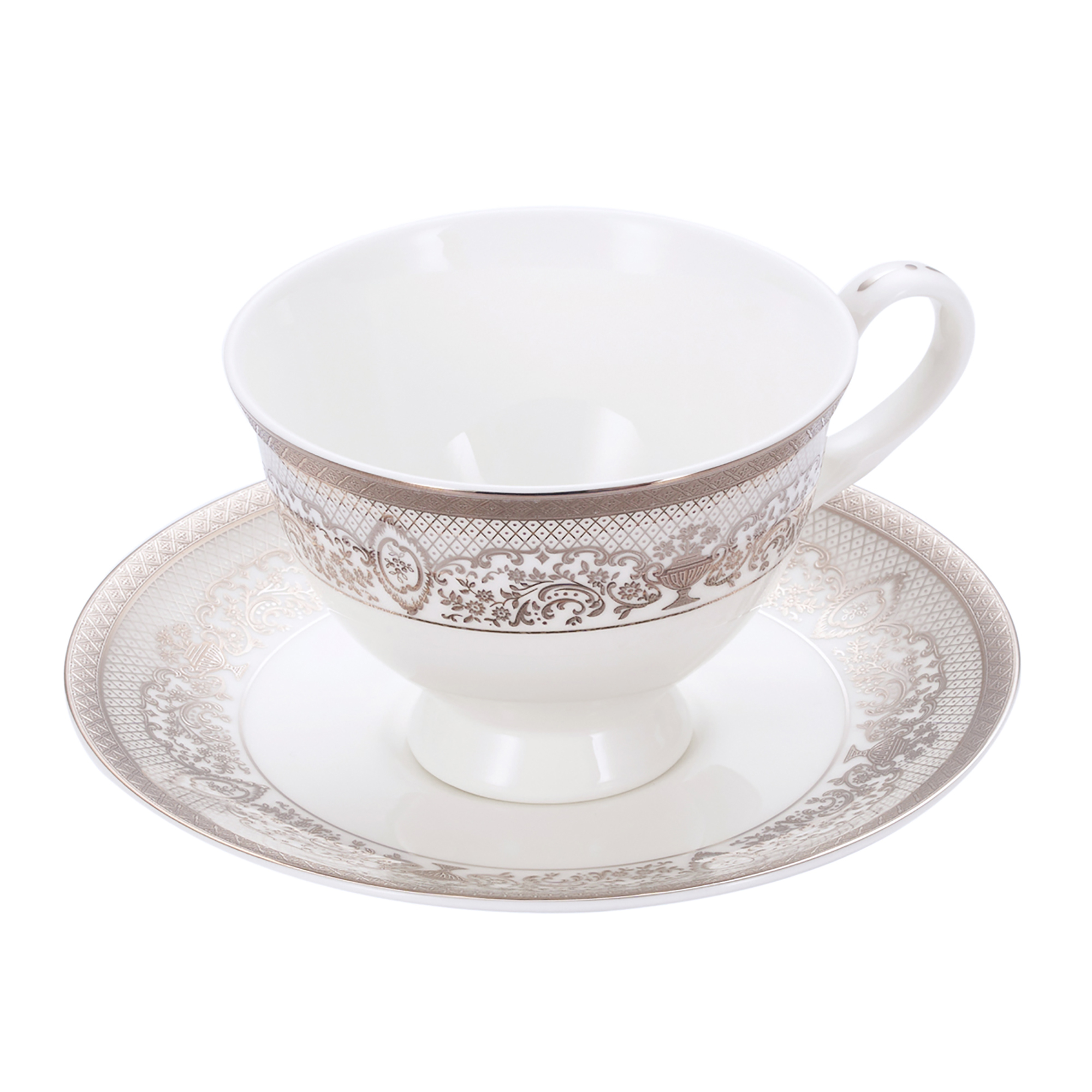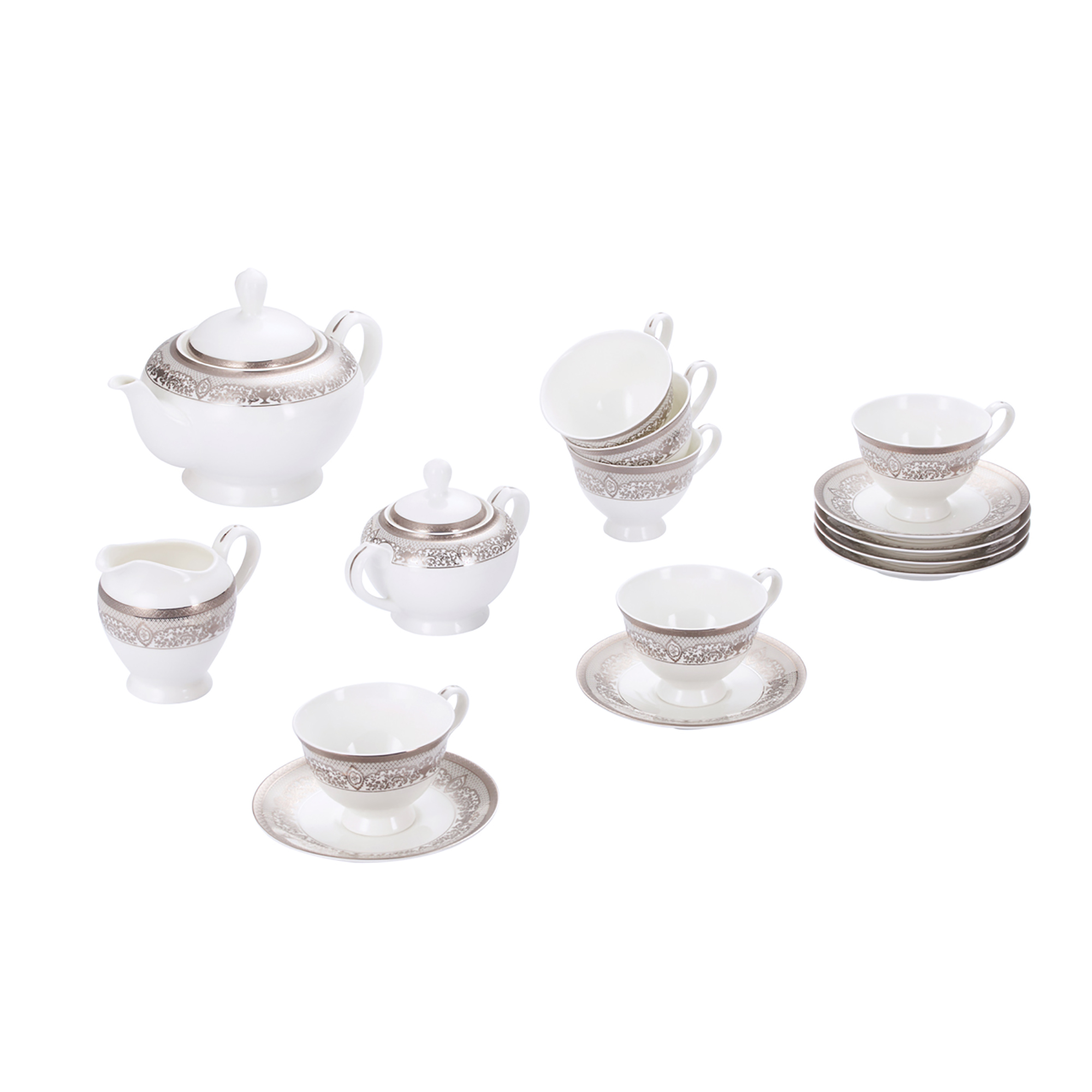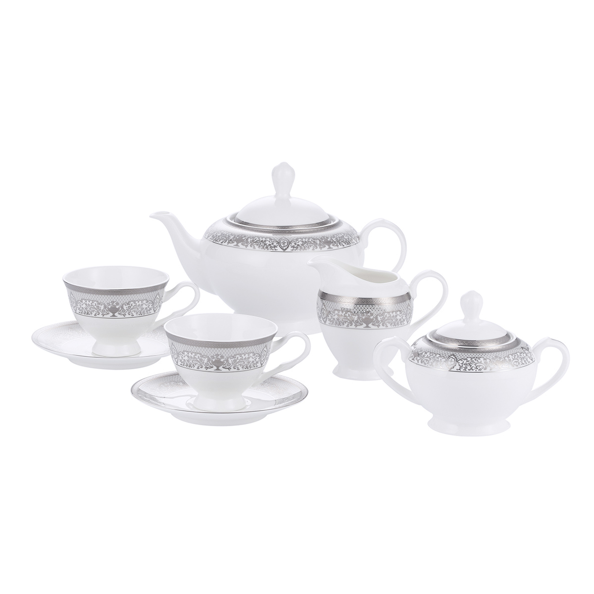 Сервиз чайный GIPFEL ARGENTO 40989 на 6 персон. Сервиз состоит из 15 предметов: чашка 200мл, 6шт., блюдце 16см, 6шт., чайник заварочный, 1200мл, 1шт., молочник, 1 шт., сахарница, 1 шт. Цвет: белый с серебристым кантом. Материал: премиальный фарфор.