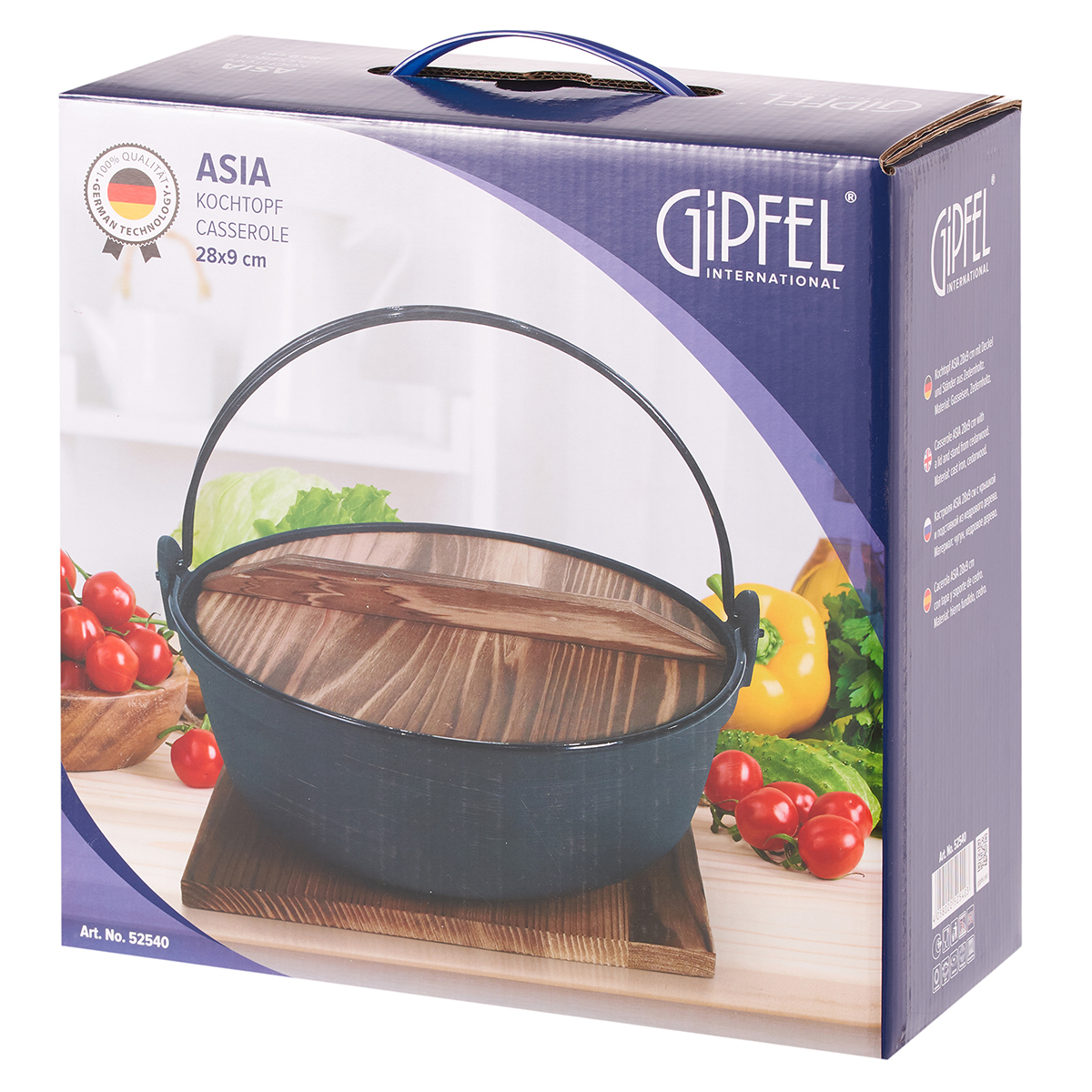 Чугунная кастрюля Gipfel Asia 52540. Размер 28х9 см. Объем 3 л. Кастрюля в комплекте с крышкой и подставкой из кедрового дерева. Изготовлена из чугуна без покрытия.