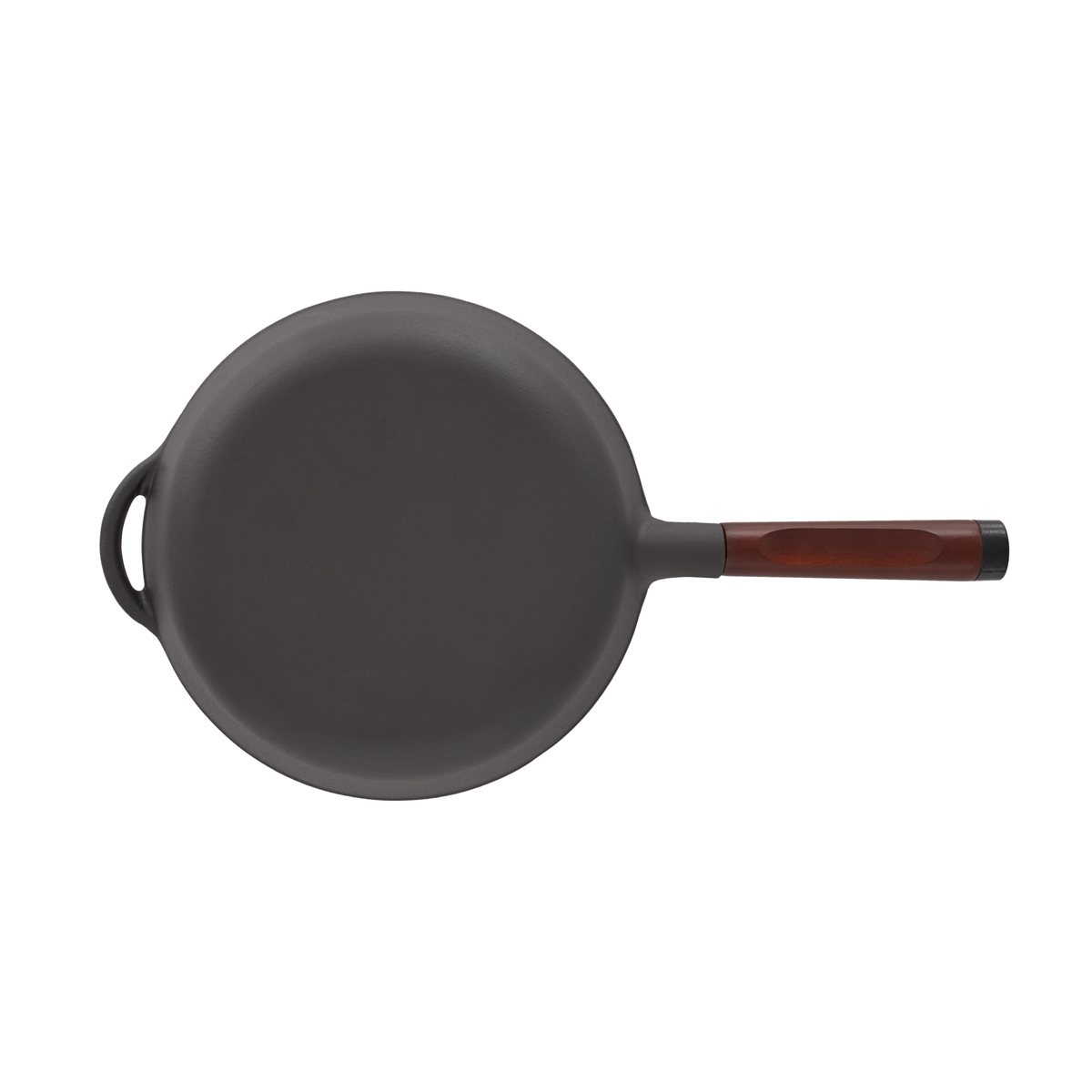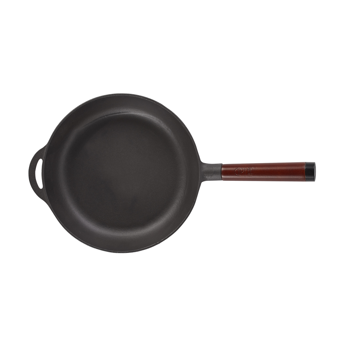 У сковороды Gipfel Amanta есть особенность: с одной стороны деревянная ручка, а с другой маленькая чугунная, ее удобно держать двумя руками. Деревянная ручка не нагревается. Меленькую чугунную ручку можно использовать как крючок.