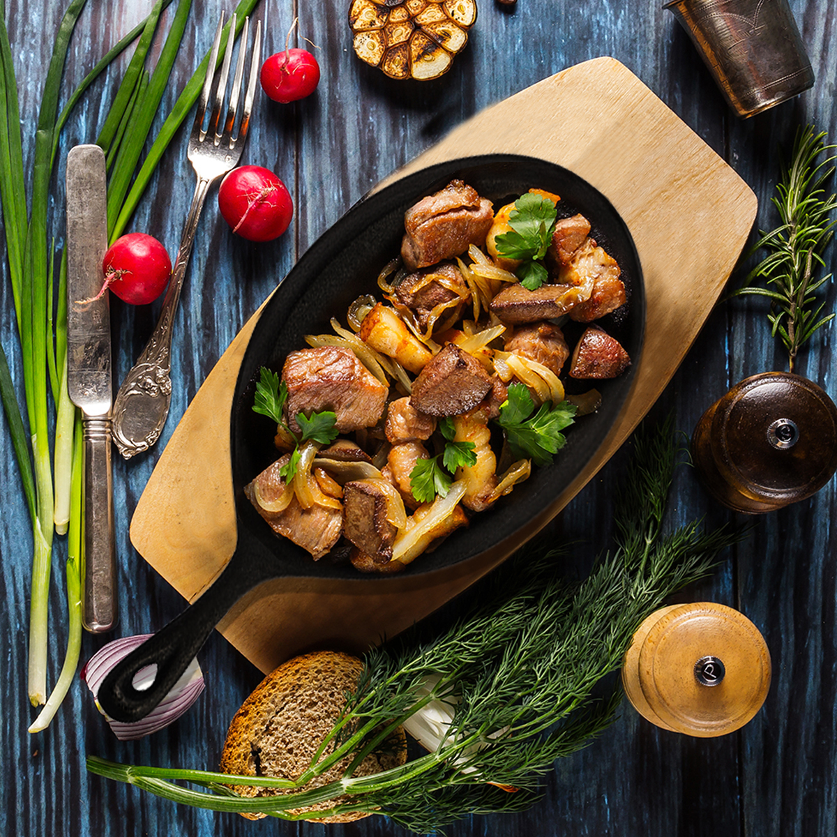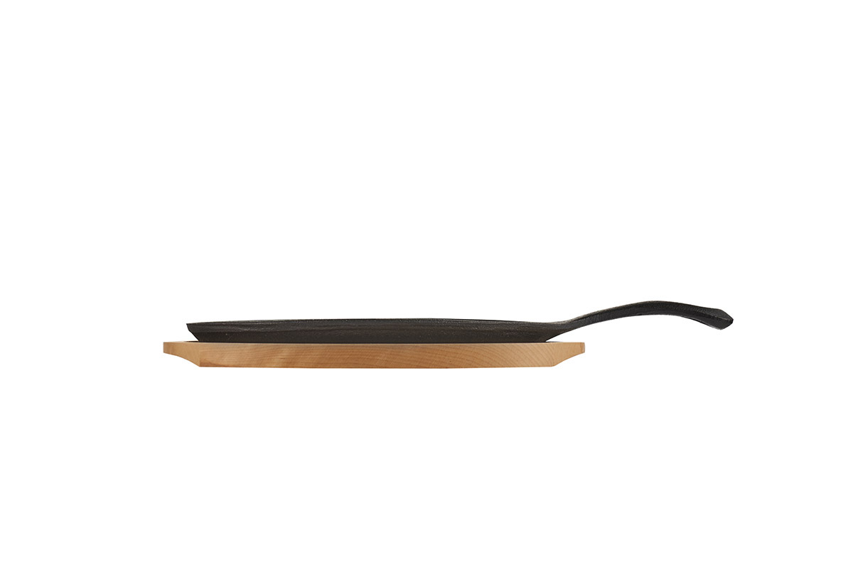 Посуда в таком дизайне непременно привнесёт нотки изысканности вашей кухне. Сковорода изготовлена из чугуна без покрытия. Допускается сервировка приготовленного блюда на стол прямо в сковороде, поэтому в комплект входит деревянная подставка. Размер сковороды 23х17,5х1,5см, длина с ручкой 36см. Размер подставки 29х19х1,5см.