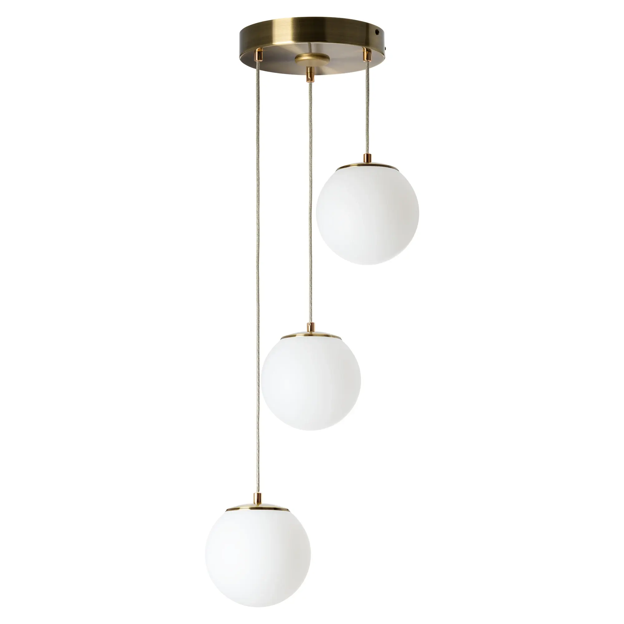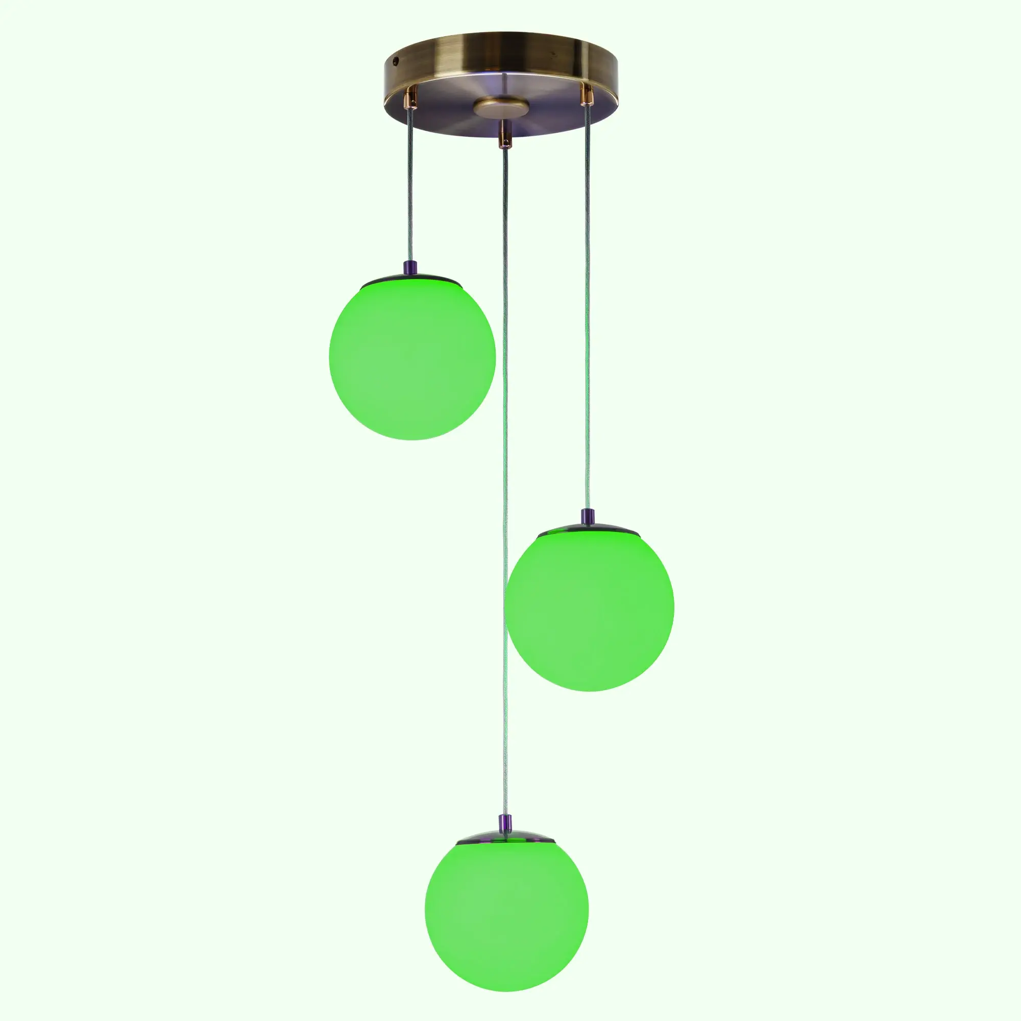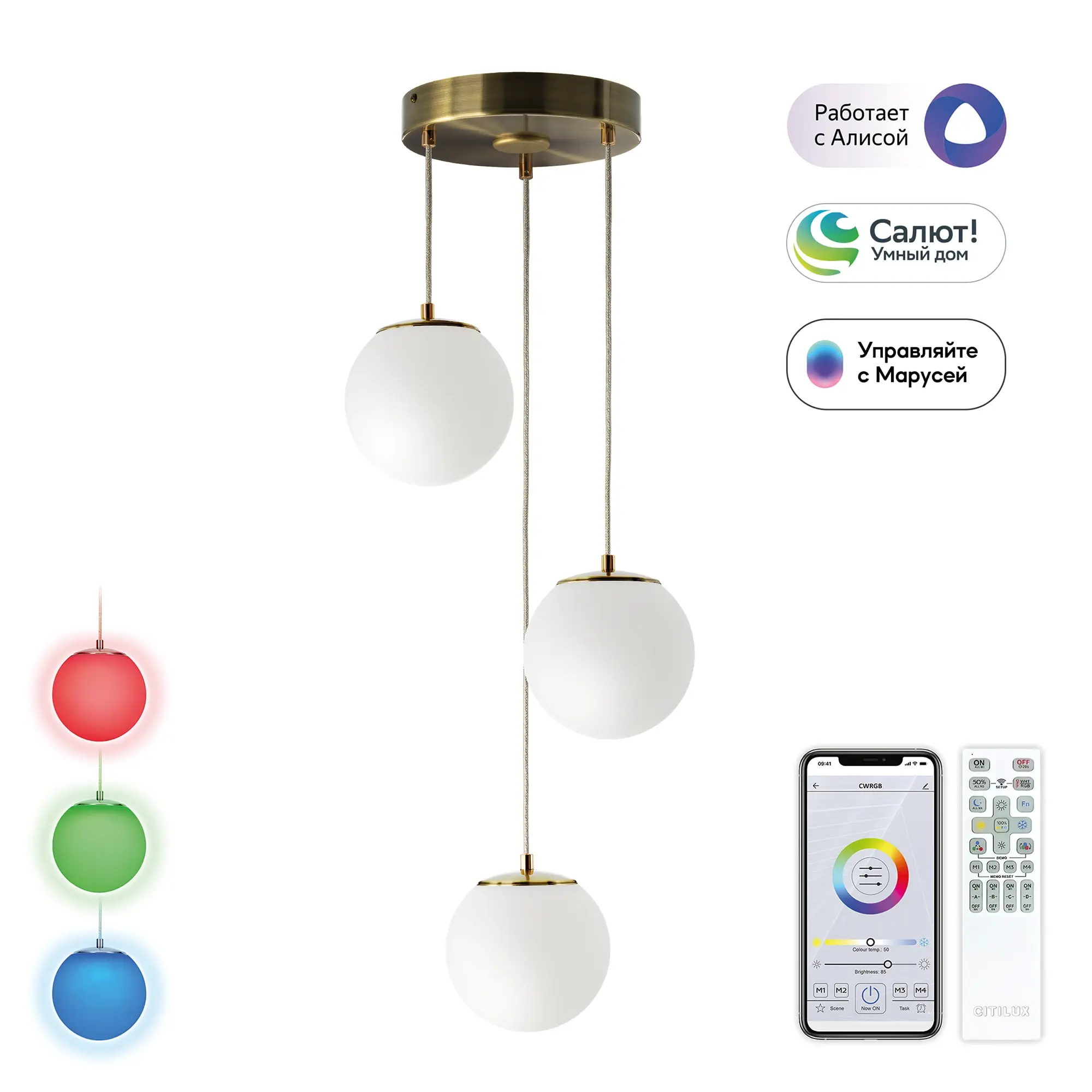 Основание светильника металлическое, круглой формы, цвет - благородная бронза. Три плафона в форме шара, изготовлены из матового оптического полимера, подвешены ниспадающим каскадом. Внутри каждого плафона расположена уникальная светодиодная панель, обеспечивающая яркое основное освещение или красочную RGB подсветку, с плавной регулировкой яркости во всех режимах света.