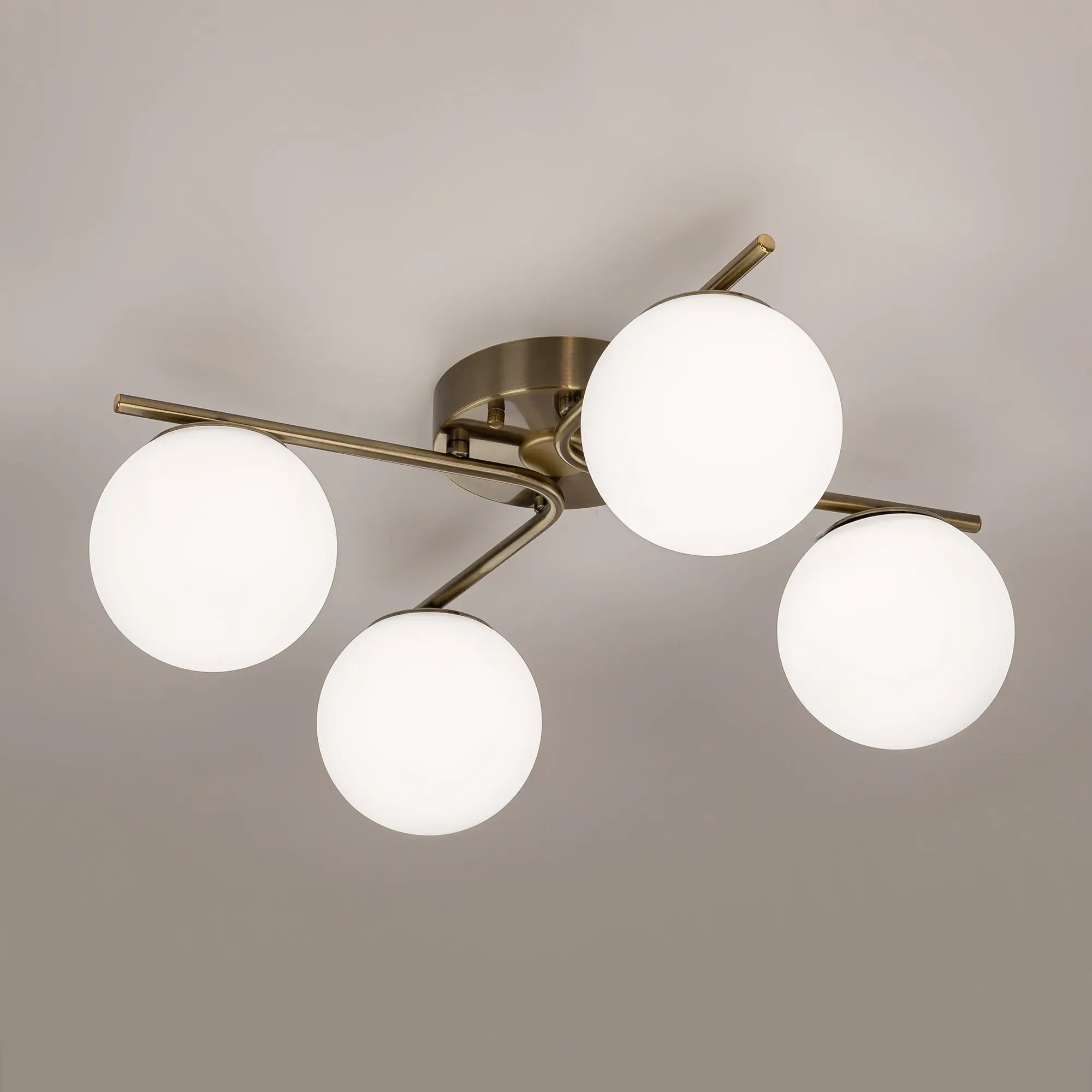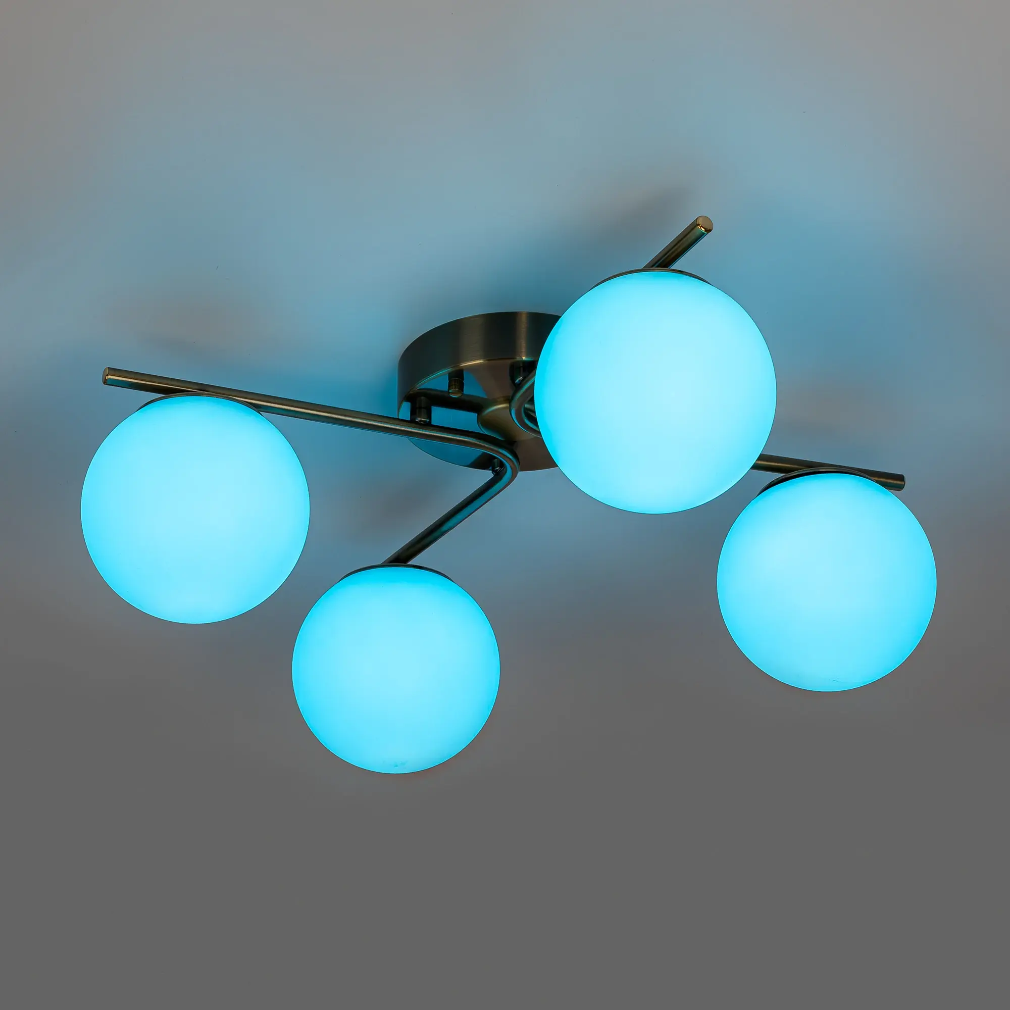 Люстра четырёхрожковая с круглым основанием, корпус металлический, цвет благородная бронза. Плафоны в форме шара, изготовлены из оптического полимера, цвет белый матовый. Внутри каждого плафона расположена уникальная светодиодная панель, обеспечивающая яркое основное освещение или красочную RGB подсветку, с плавной регулировкой яркости во всех режимах света.